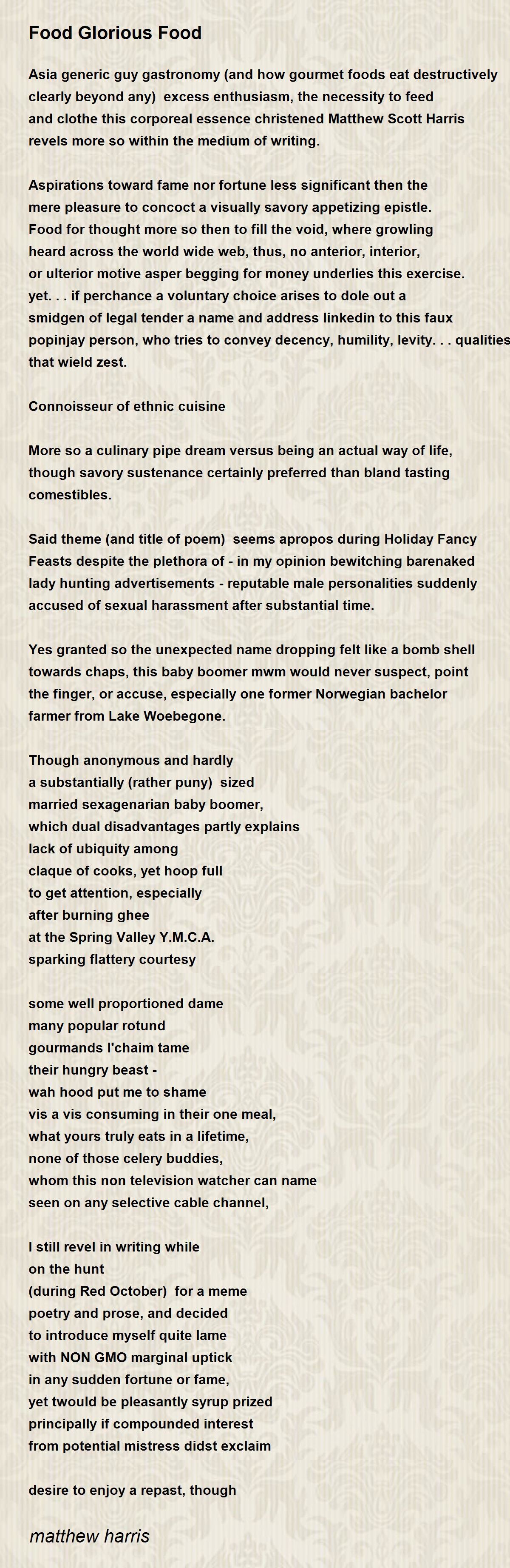 Said theme (and title of poem) seems apropos during Holiday Fancy Feasts despite the plethora of - in my opinion bewitching barenaked lady hunting advertisements - reputable male personalities suddenly accused of sexual harassment after substantial time.