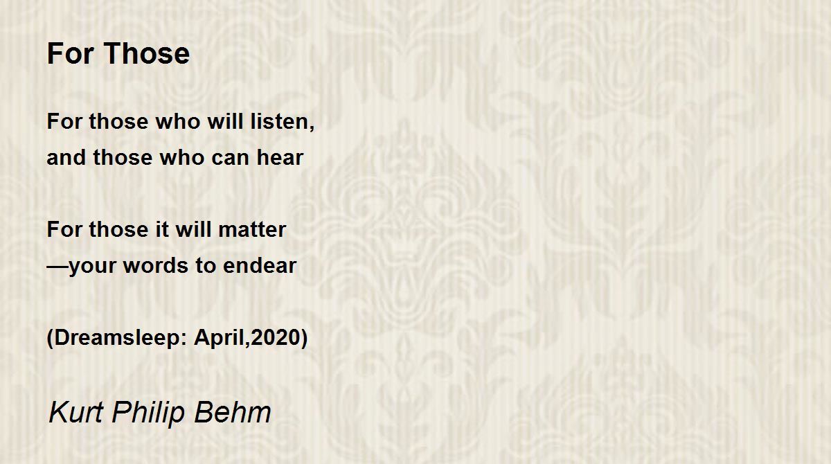 For those who will listen, and those who can hear For those it will matter —your words to endear (Dreamsleep: April,2020)