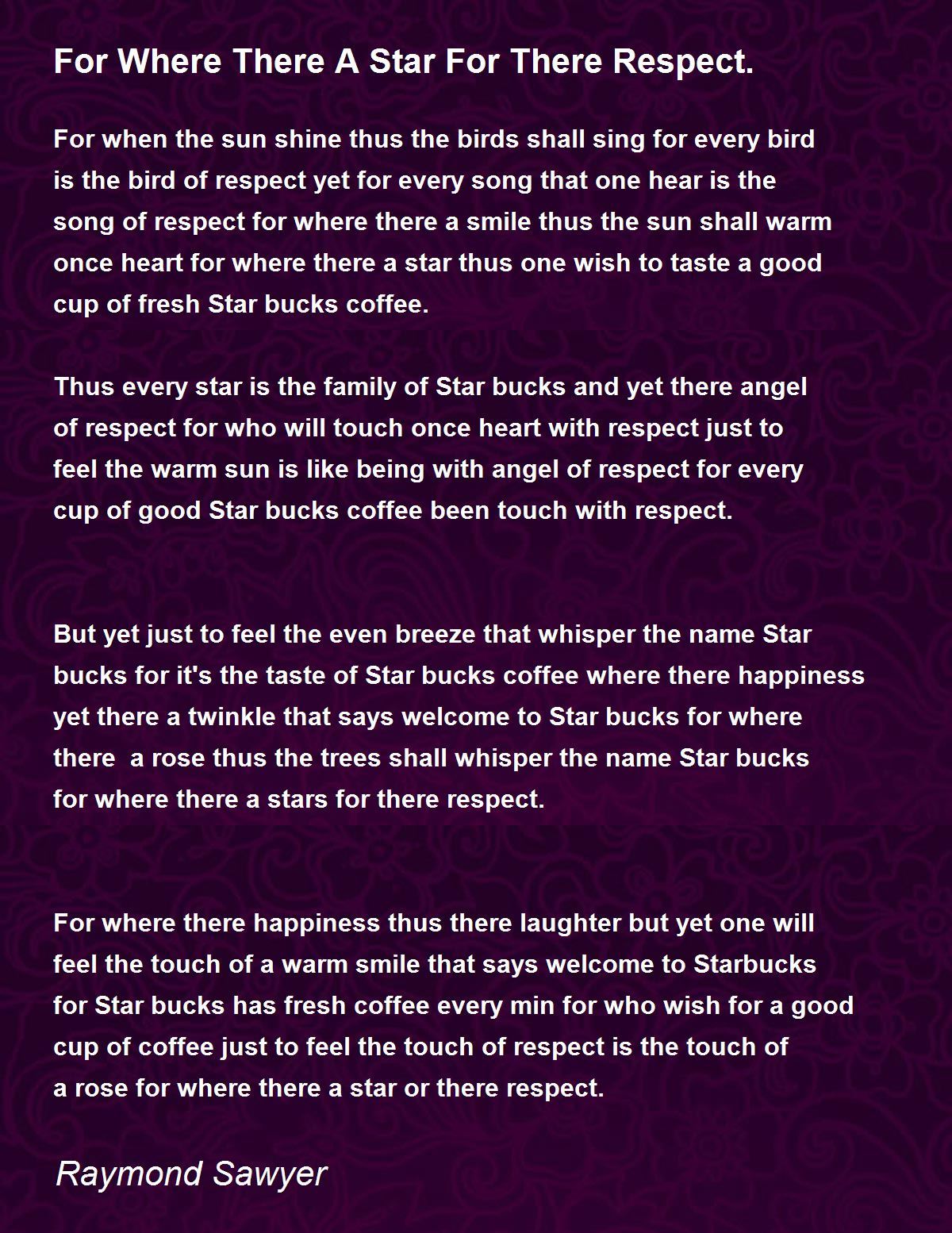 For when the sun shine thus the birds shall sing for every bird is the bird of respect yet for every song that one hear is the song of respect for where there a smile thus the sun shall warm once heart for where there a star thus one wish to taste a good cup of fresh Star bucks coffee.