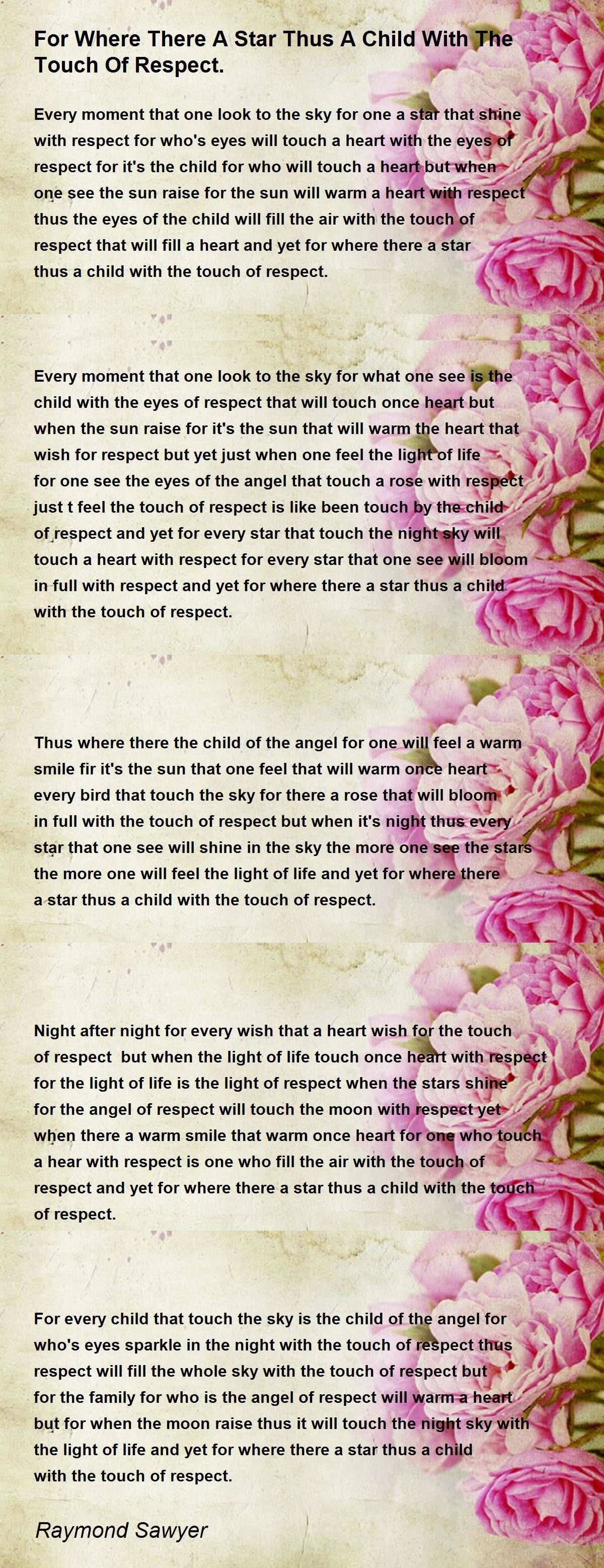 Every moment that one look to the sky for one a star that shine with respect for who's eyes will touch a heart with the eyes of respect for it's the child for who will touch a heart but when one see the sun raise for the sun will warm a heart with respect thus the eyes of the child will fill the air with the touch of respect that will fill a heart and yet for where there a star thus a child with the touch of respect.