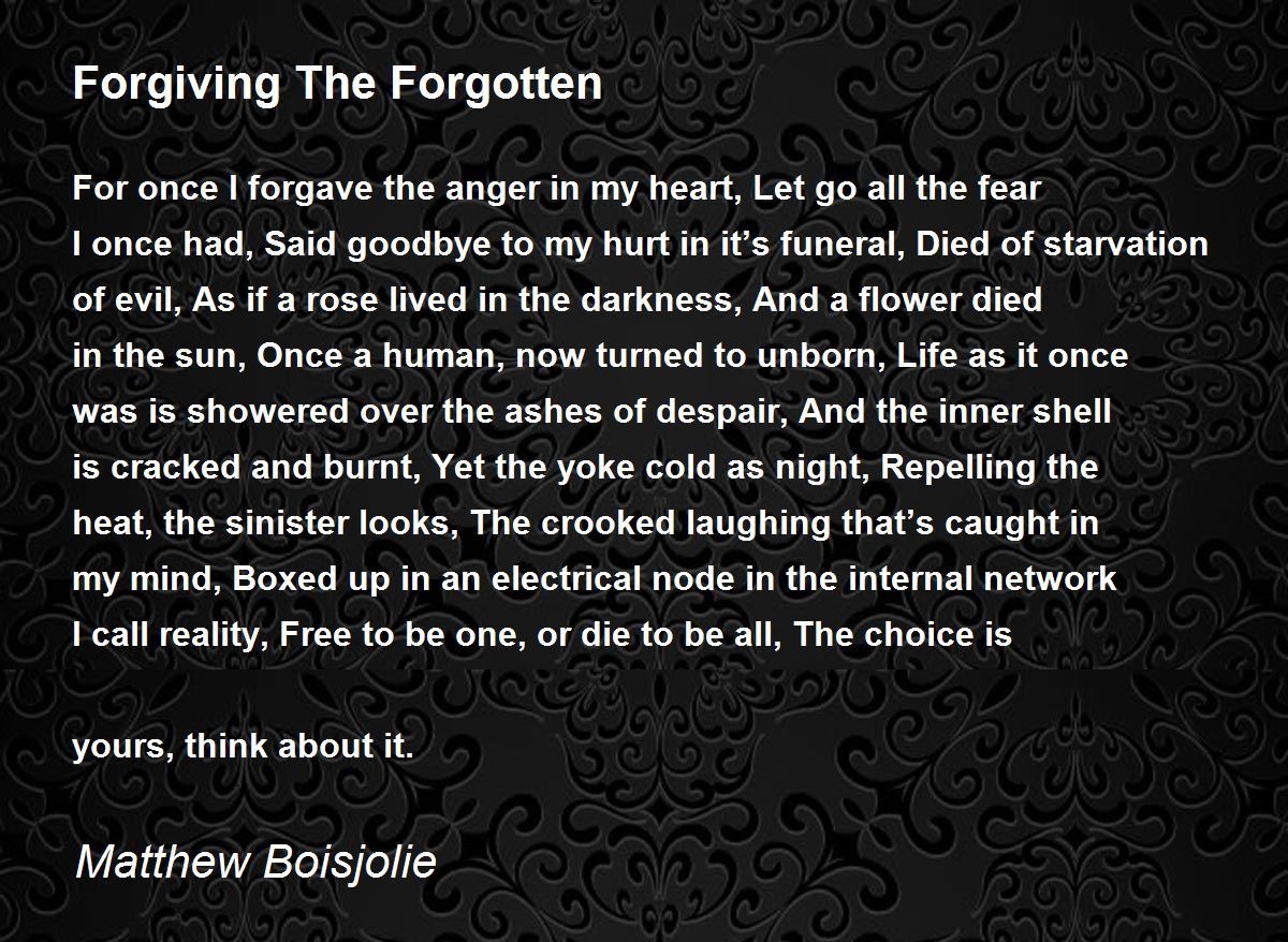 For once I forgave the anger in my heart, Let go all the fear I once had, Said goodbye to my hurt in it’s funeral, Died of starvation of evil, As if a rose lived in the darkness, And a flower died in the sun, Once a human, now turned to unborn, Life as it once was is showered over the ashes of despair, And the inner shell is cracked and burnt, Yet the yoke cold as night, Repelling the heat, the sinister looks, The crooked laughing that’s caught in my mind, Boxed up in an electrical node in the internal network I call reality, Free to be one, or die to be all, The choice is yours, think about it.