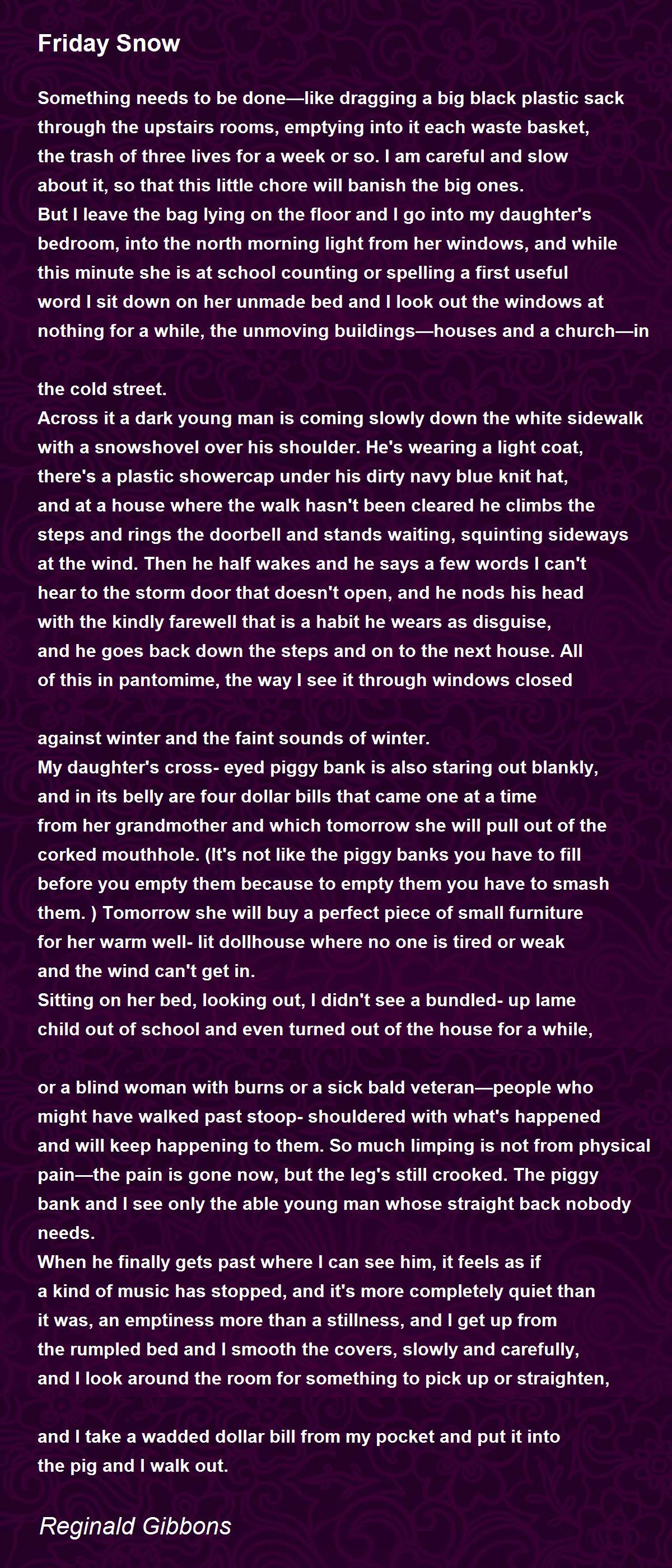 Across it a dark young man is coming slowly down the white sidewalk with a snowshovel over his shoulder. He's wearing a light coat, there's a plastic showercap under his dirty navy blue knit hat, and at a house where the walk hasn't been cleared he climbs the steps and rings the doorbell and stands waiting, squinting sideways at the wind. Then he half wakes and he says a few words I can't hear to the storm door that doesn't open, and he nods his head with the kindly farewell that is a habit he wears as disguise, and he goes back down the steps and on to the next house. All of this in pantomime, the way I see it through windows closed against winter and the faint sounds of winter.