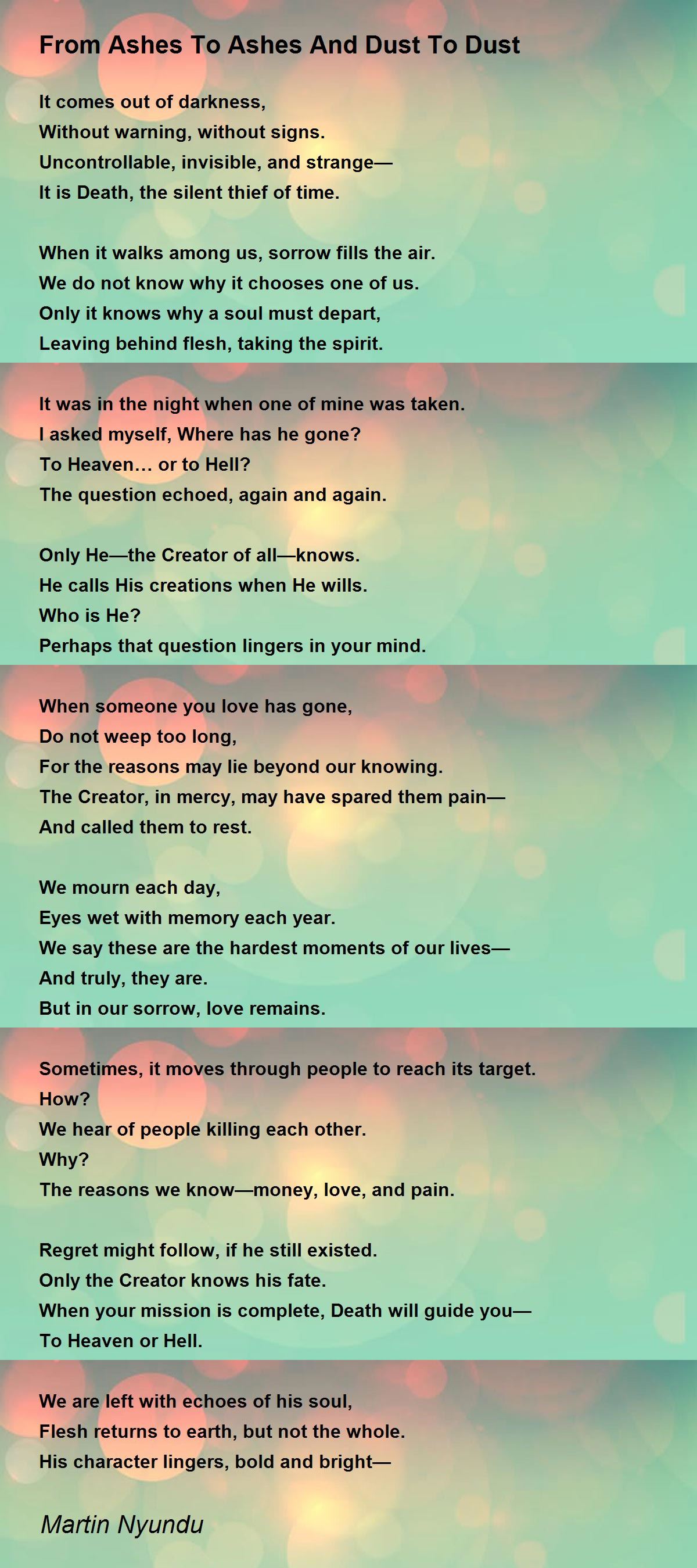 Really an insightful piece on ' from dust to dust' - which is a must. Well conceived and nicely brought forth in persuasive expressions with conviction. An insightful work of art. Thanks for sharing.