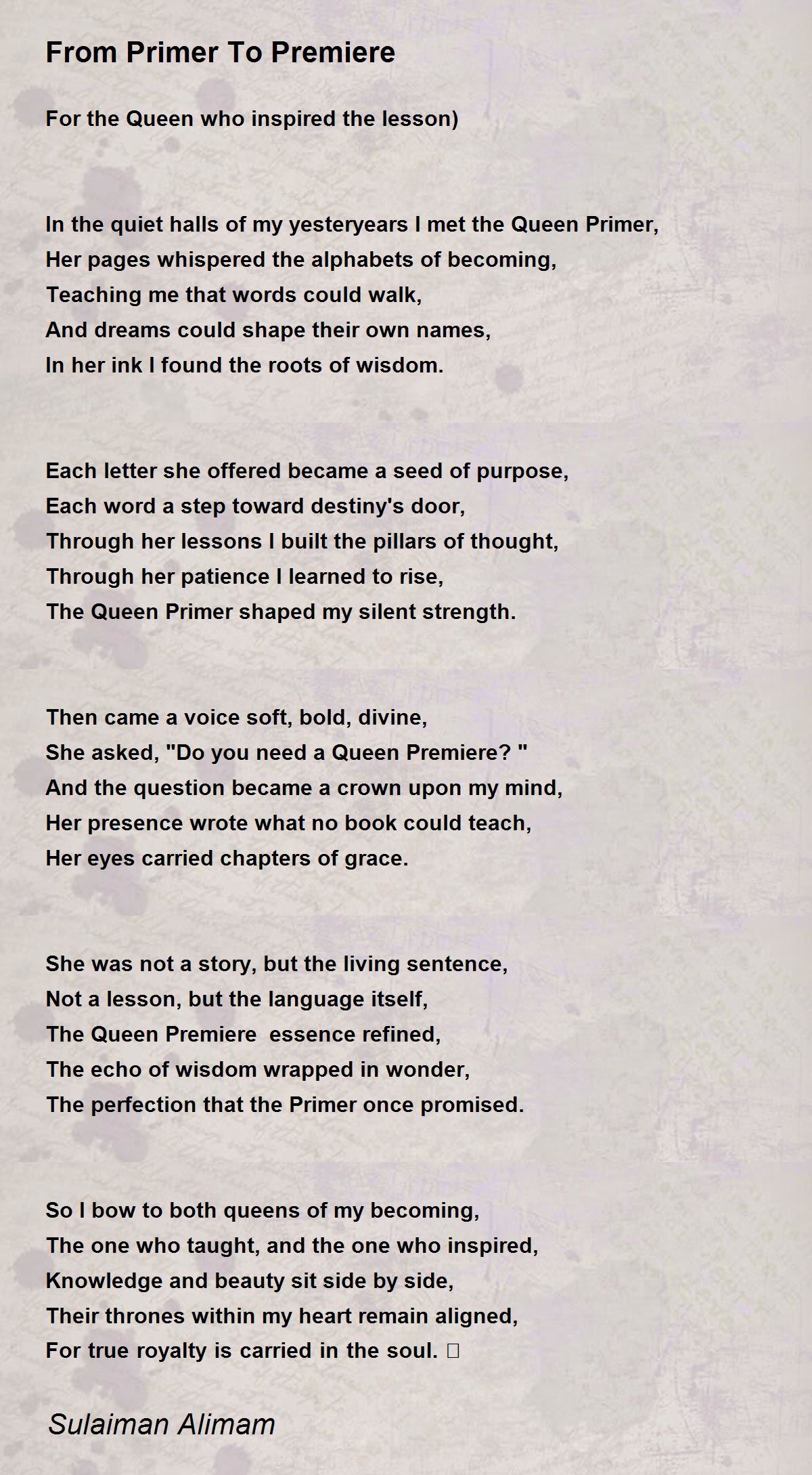 In the quiet halls of my yesteryears I met the Queen Primer,