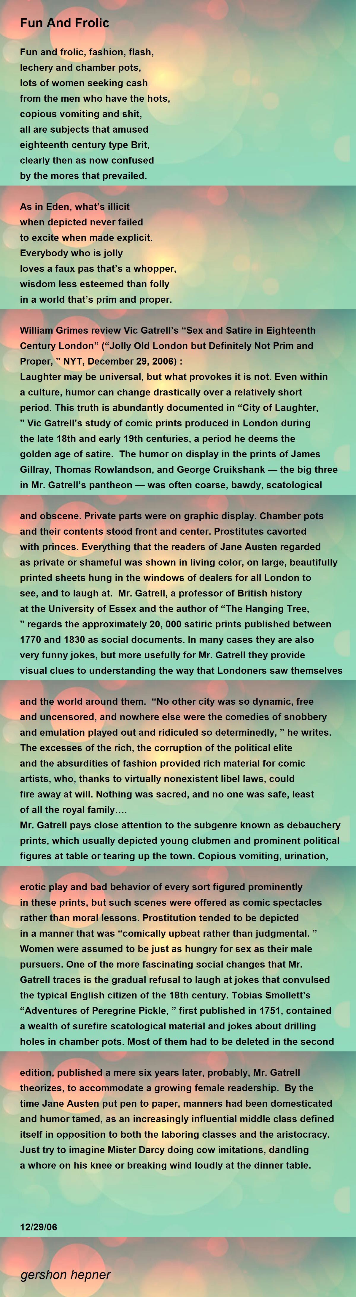 William Grimes review Vic Gatrell’s “Sex and Satire in Eighteenth Century London” (“Jolly Old London but Definitely Not Prim and Proper, ” NYT, December 29,2006) :