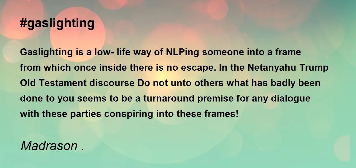 Gaslighting is a low-life way of NLPing someone into a frame from which once inside there is no escape. In the Netanyahu Trump Old Testament discourse Do not unto others what has badly been done to you seems to be a turnaround premise for any dialogue with these parties conspiring into these frames!