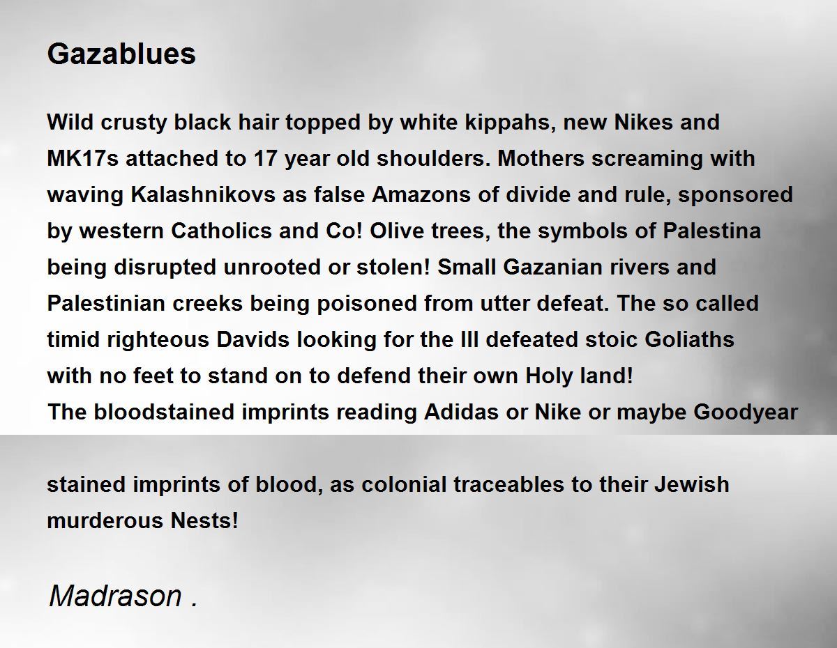 Wild crusty black hair topped by white kippahs, new Nikes and MK17s attached to 17 year old shoulders. Mothers screaming with waving Kalashnikovs as false Amazons of divide and rule, sponsored by western Catholics and Co! Olive trees, the symbols of Palestina being disrupted unrooted or stolen! Small Gazanian rivers and Palestinian creeks being poisoned from utter defeat. The so called timid righteous Davids looking for the Ill defeated stoic Goliaths with no feet to stand on to defend their own Holy land!