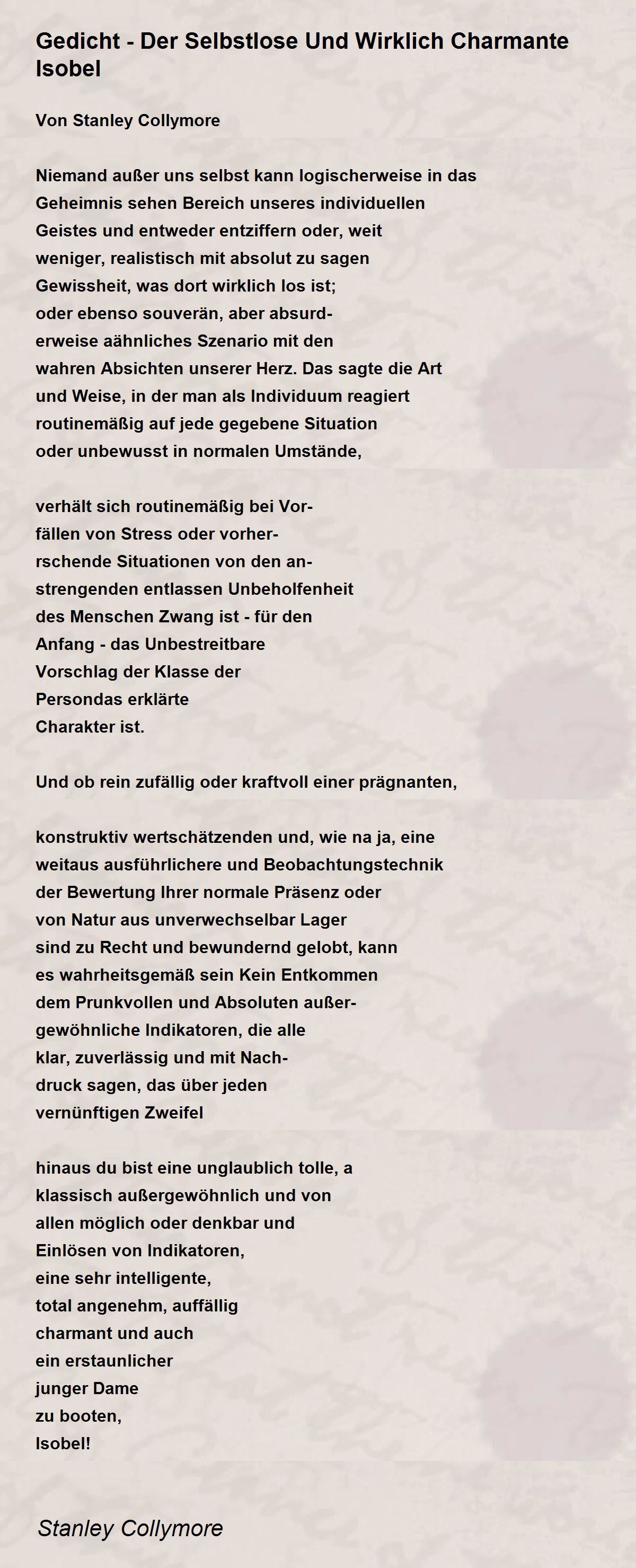 Eine so angenehme Begegnung mit jungen Leuten des Kalibers Isobel, die einen individualistischeren Charakter, eine außergewöhnliche Rücksichtnahme auf andere und eine unbestreitbar außergewöhnliche Intelligenz in ihrem kleinen Finger haben, als alle diese wahnhaften, fetten und vermeintlichen erwachsenen Idioten in ihren kollektiven Körpern sprechen Bände an sich. Und bestätigt mit Sicherheit die ernsthafte Überzeugung aller kompositorischen, ausgewogenen und intelligenten Beobachter, dass in Bezug auf Großbritannien gesellschaftlich nicht alles verloren geht.