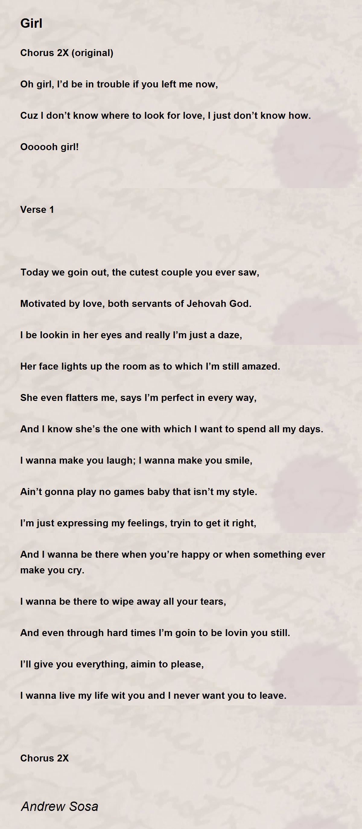 This is the male version of the I love you so much poems that I often read from women and girls but so rarely so from men and boys. I thought this is one of the best of these that I have ever read. It was all complete in every way. I can't imagine a woman or girl not wanting to hear something like this. All in all, it was wonderful! My compliments to the writer. GW62