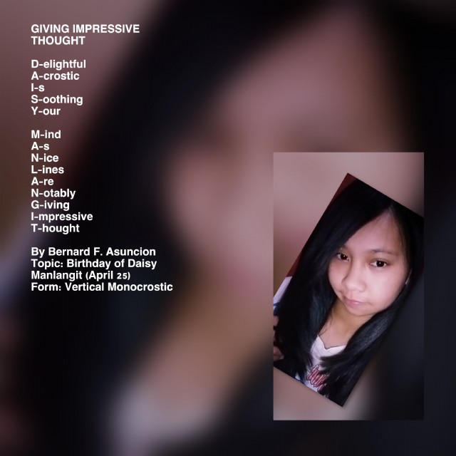 Birthday of Daisy Manlangit is well executed. Thanks for sharing this poem with nice graphic.