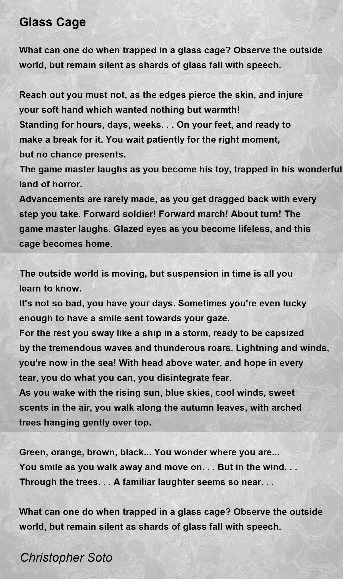 What can one do when trapped in a glass cage? Observe the outside world, but remain silent as shards of glass fall with speech.