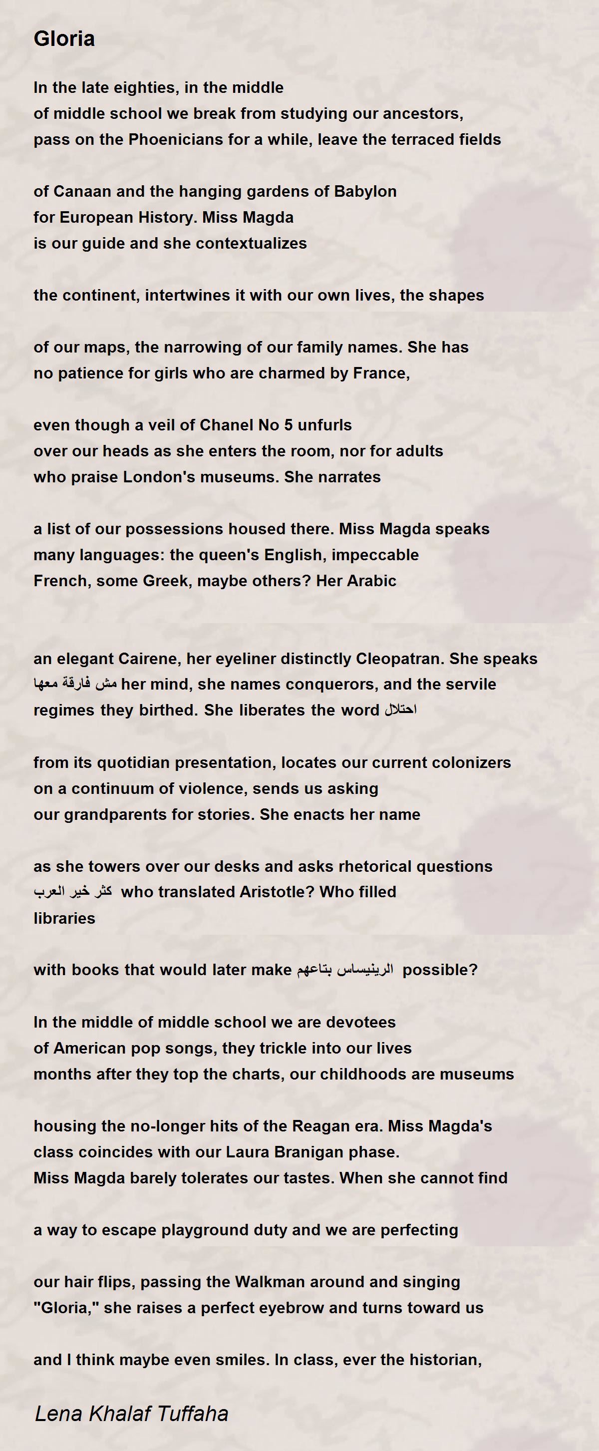 "Gloria," she raises a perfect eyebrow and turns toward us