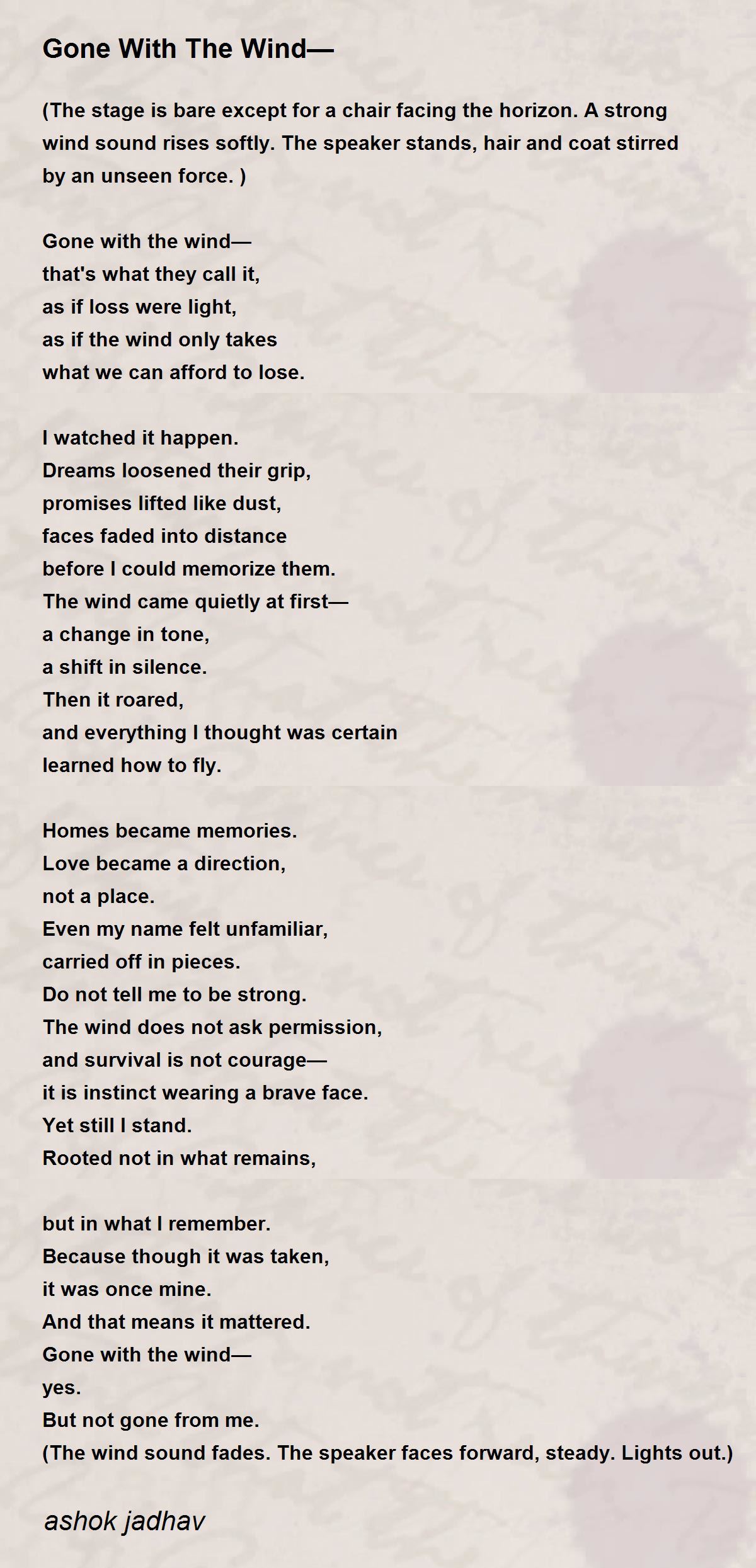 (The wind sound fades. The speaker faces forward, steady. Lights out.)