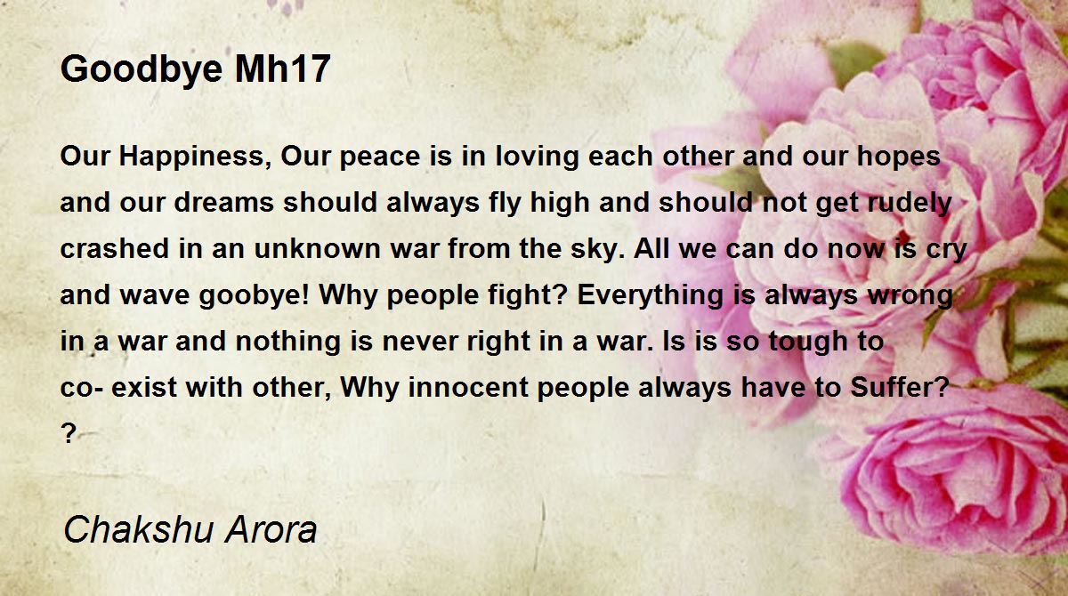 Our Happiness, Our peace is in loving each other and our hopes and our dreams should always fly high and should not get rudely crashed in an unknown war from the sky.All we can do now is cry and wave goobye! Why people fight? Everything is always wrong in a war and nothing is never right in a war.Is is so tough to co-exist with other, Why innocent people always have to Suffer? ?