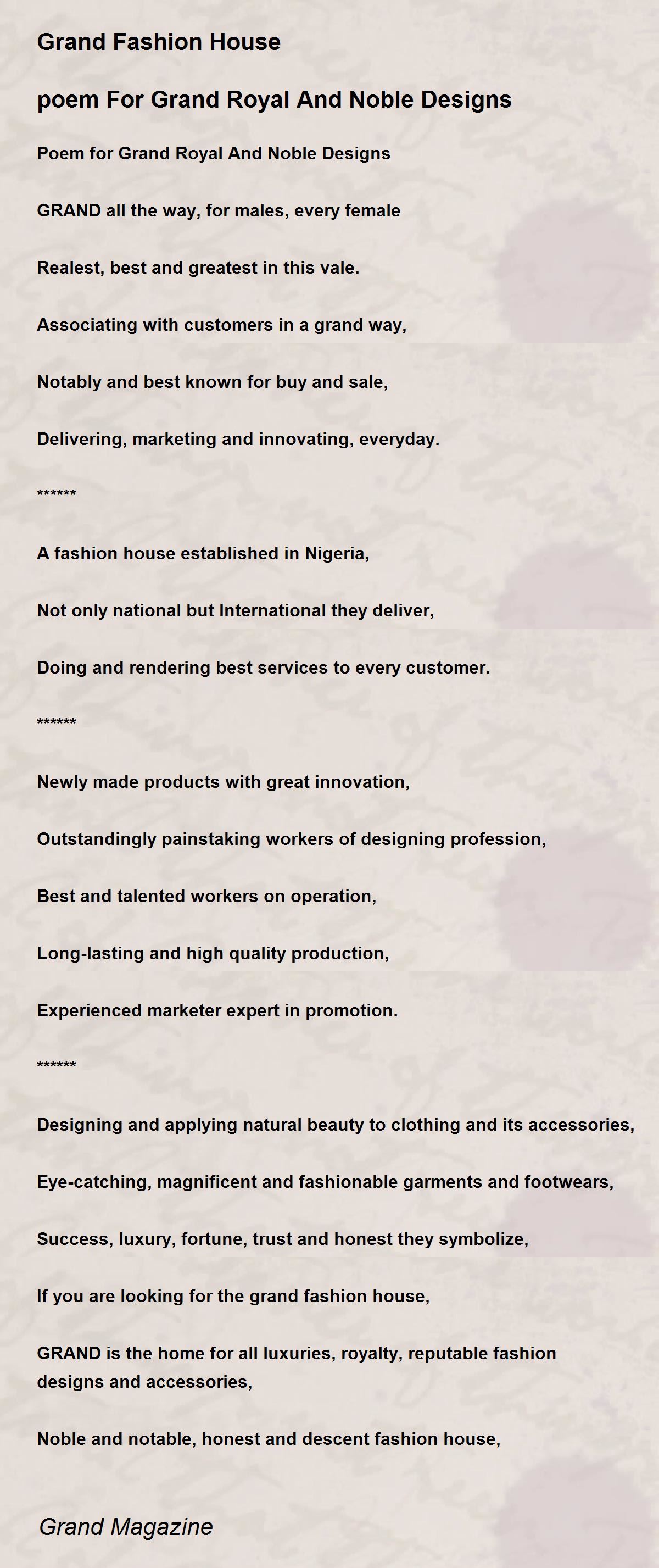 Poem for Grand Royal And Noble Designs