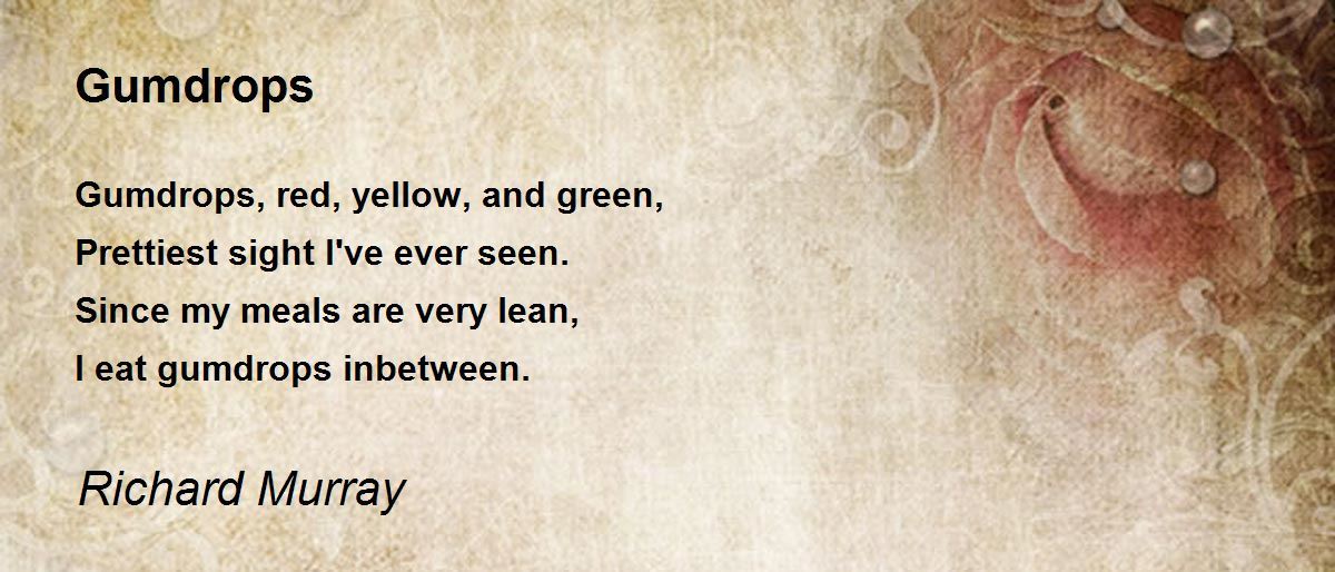 Gumdrops, red, yellow, and green, Prettiest sight I've ever seen. Since my meals are very lean, I eat gumdrops inbetween.