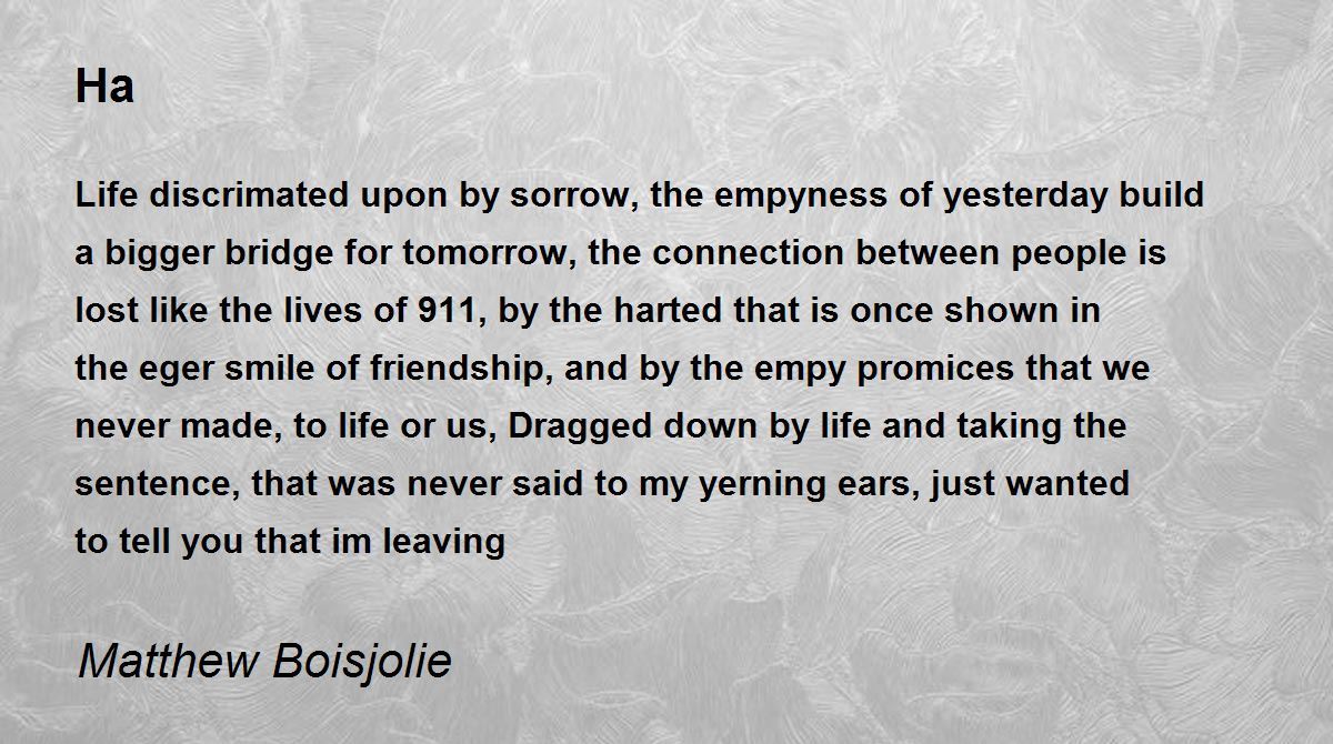 Life discrimated upon by sorrow, the empyness of yesterday build a bigger bridge for tomorrow, the connection between people is lost like the lives of 911, by the harted that is once shown in the eger smile of friendship, and by the empy promices that we never made, to life or us, Dragged down by life and taking the sentence, that was never said to my yerning ears, just wanted to tell you that im leaving