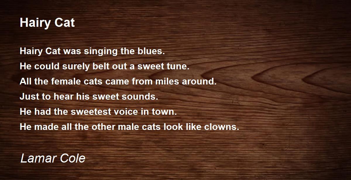 Hi Lamar, so good to see your poem- Hairy Cat! As always, the poem rhymes with fun and humour. Five stars for the cat who had the sweetest voice in town. I take this opportunity to wish you a happy New Year.