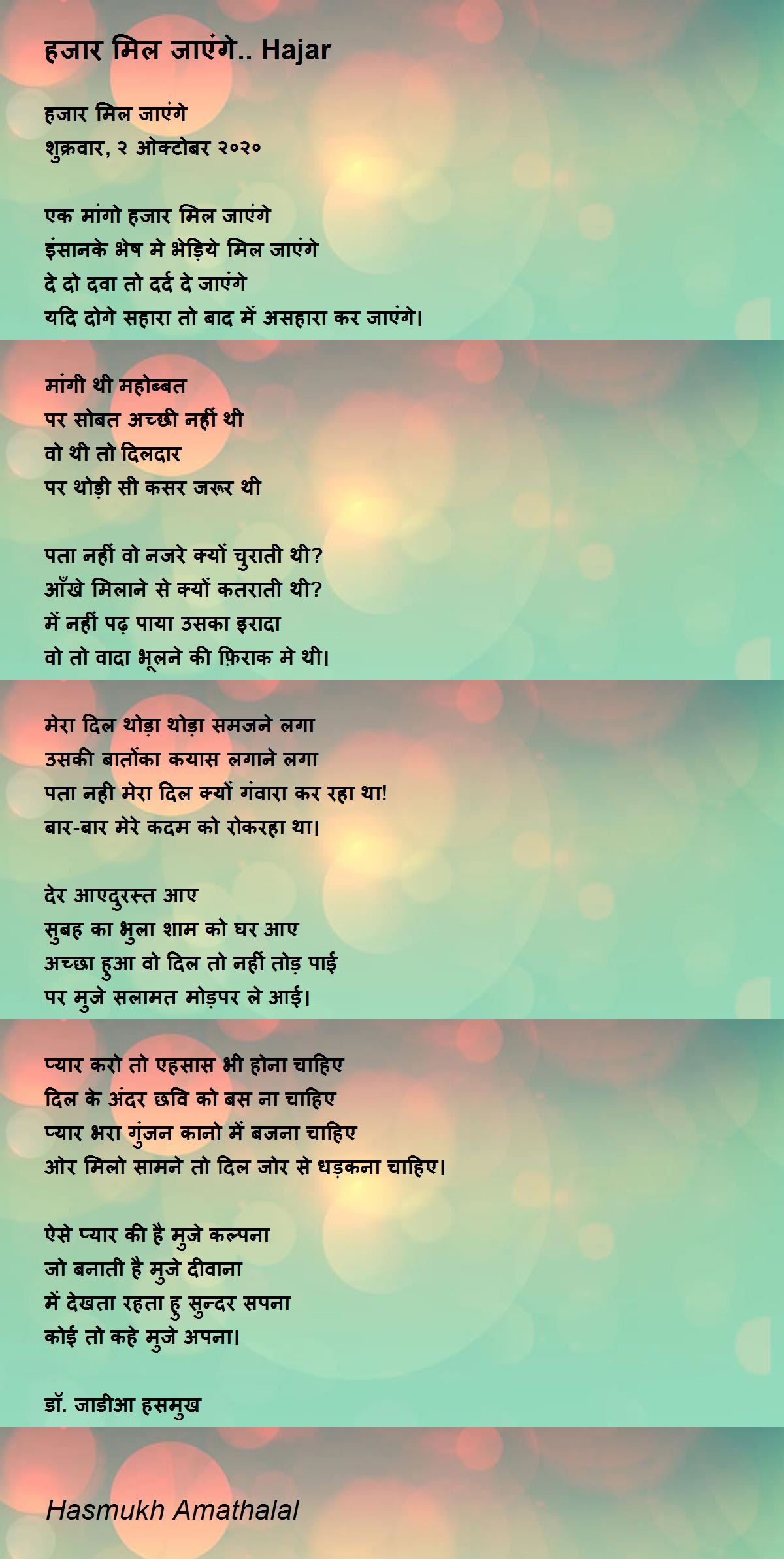 में देखता रहता हु सुन्दर सपना कोई तो कहे मुजे अपना। डॉ. जाडीआ हसमुख