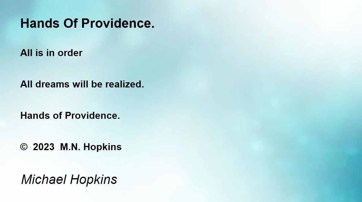 Note: I wrote this poem yesterday in the haiku style of poetry taken from a prayer that came through my mind many years ago. It turns out the first two verses of the prayer were already in haiku form, I just had to short the third line. Here is the original prayer which I just shorted, All is in order. All dreams will be realized. Trust in the hands of Providence. I published it for the first time today, the 27th of February,2023.