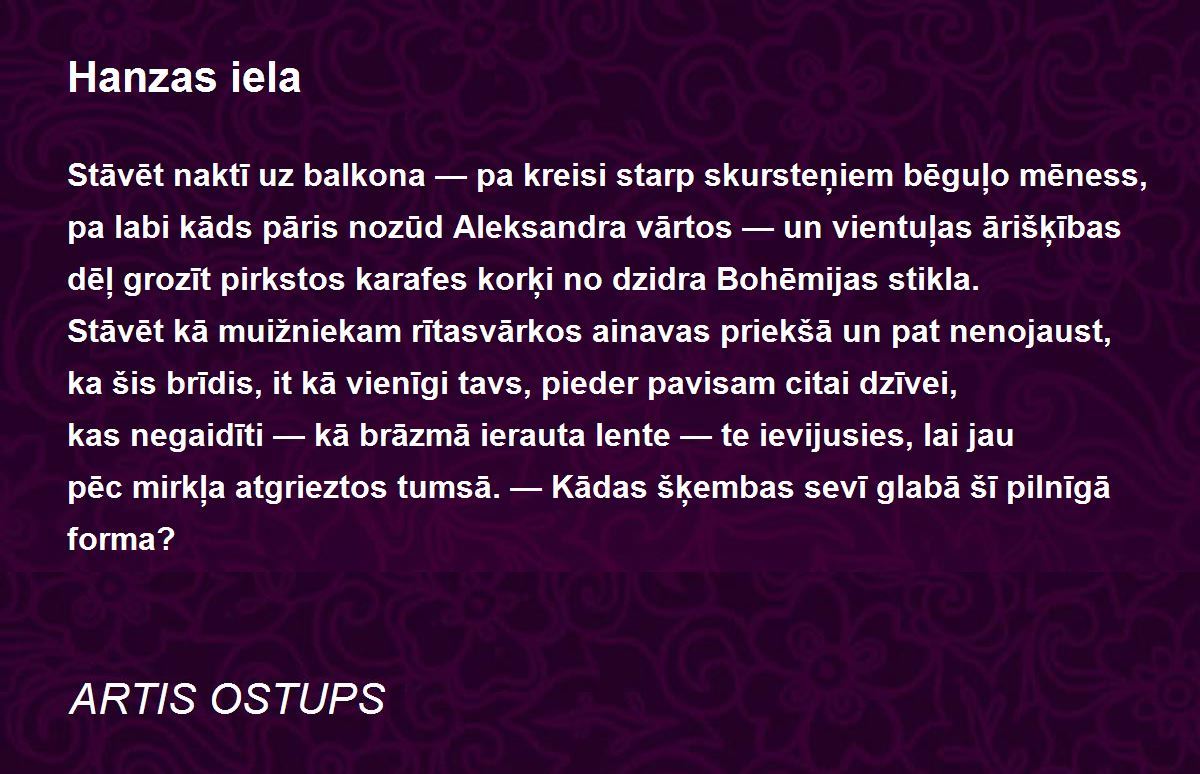 Stāvēt naktī uz balkona — pa kreisi starp skursteņiem bēguļo mēness, pa labi kāds pāris nozūd Aleksandra vārtos — un vientuļas ārišķības dēļ grozīt pirkstos karafes korķi no dzidra Bohēmijas stikla. Stāvēt kā muižniekam rītasvārkos ainavas priekšā un pat nenojaust, ka šis brīdis, it kā vienīgi tavs, pieder pavisam citai dzīvei, kas negaidīti — kā brāzmā ierauta lente — te ievijusies, lai jau pēc mirkļa atgrieztos tumsā. — Kādas šķembas sevī glabā šī pilnīgā forma?
