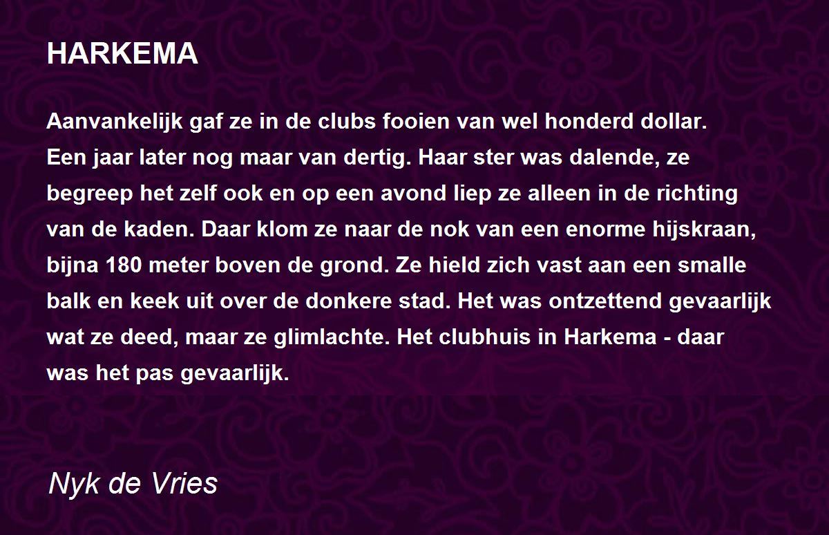 Aanvankelijk gaf ze in de clubs fooien van wel honderd dollar. Een jaar later nog maar van dertig. Haar ster was dalende, ze begreep het zelf ook en op een avond liep ze alleen in de richting van de kaden. Daar klom ze naar de nok van een enorme hijskraan, bijna 180 meter boven de grond. Ze hield zich vast aan een smalle balk en keek uit over de donkere stad. Het was ontzettend gevaarlijk wat ze deed, maar ze glimlachte. Het clubhuis in Harkema - daar was het pas gevaarlijk.