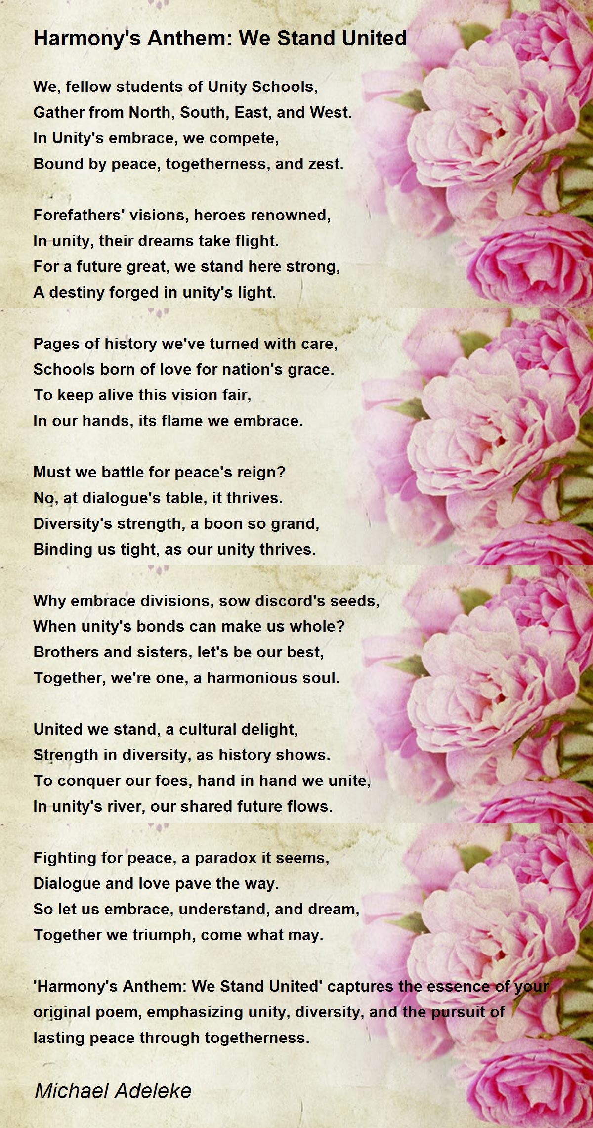 'Harmony's Anthem: We Stand United' captures the essence of your original poem, emphasizing unity, diversity, and the pursuit of lasting peace through togetherness.