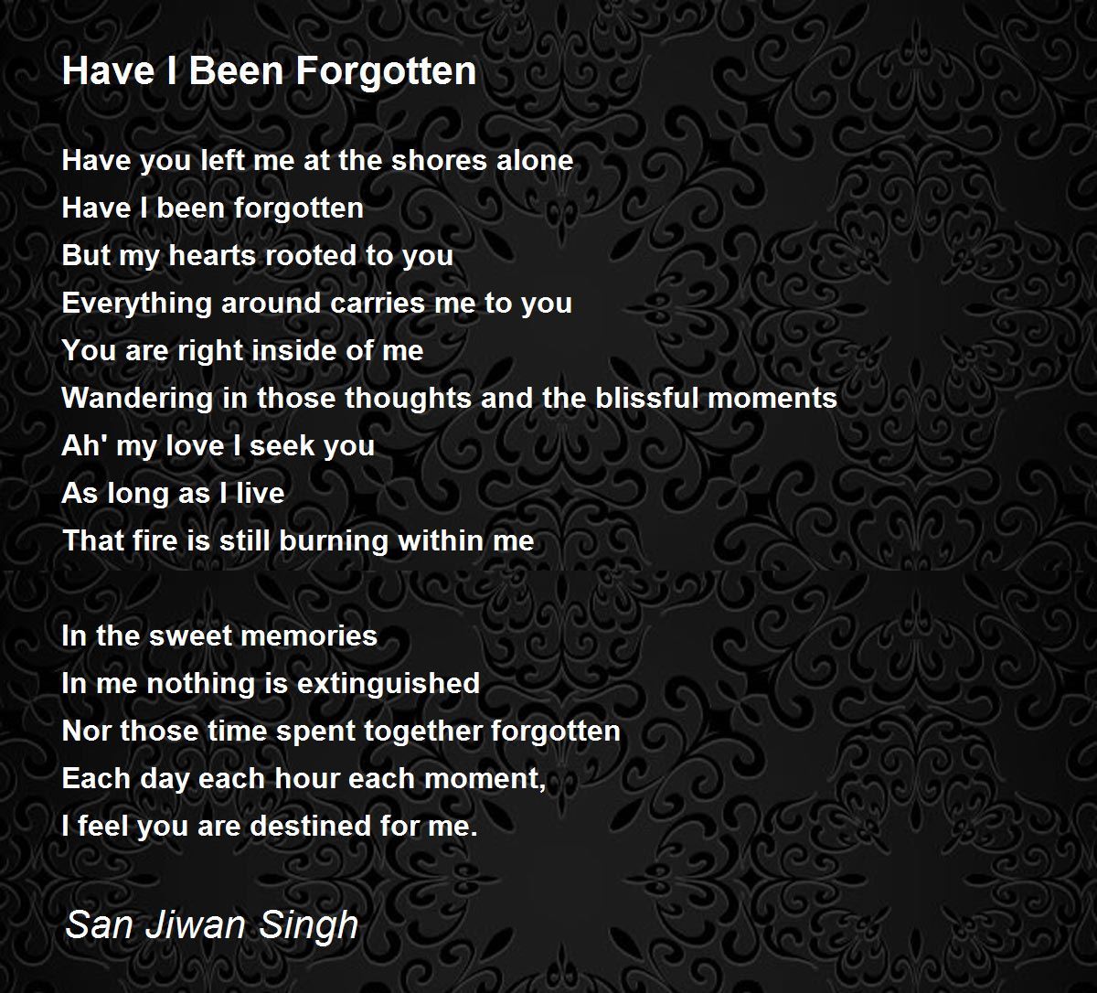 That fire is still burning within me.. Have i been forgotten? ? love in deepest sense and the sense of loss.. this is a beautiful poem very expressive of deep sentiments and memories in the context of a loss. thank you. tony