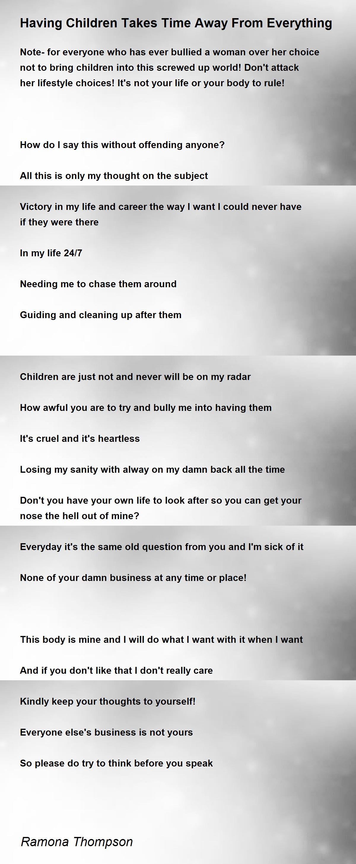 Note-for everyone who has ever bullied a woman over her choice not to bring children into this screwed up world! Don't attack her lifestyle choices! It's not your life or your body to rule!