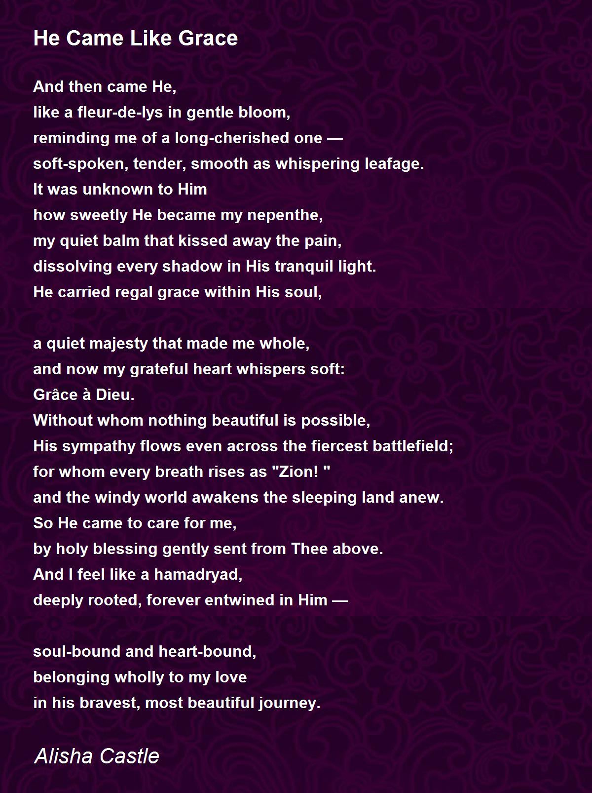 So came he to take care of me By holy blessing denoted from Thee And I feel like a hamadryad Belonging to him in his bravest journey. hamadryad in mythology. you are a person who have read a lot. that is my first impression as i read this poem. thank you very much. tony