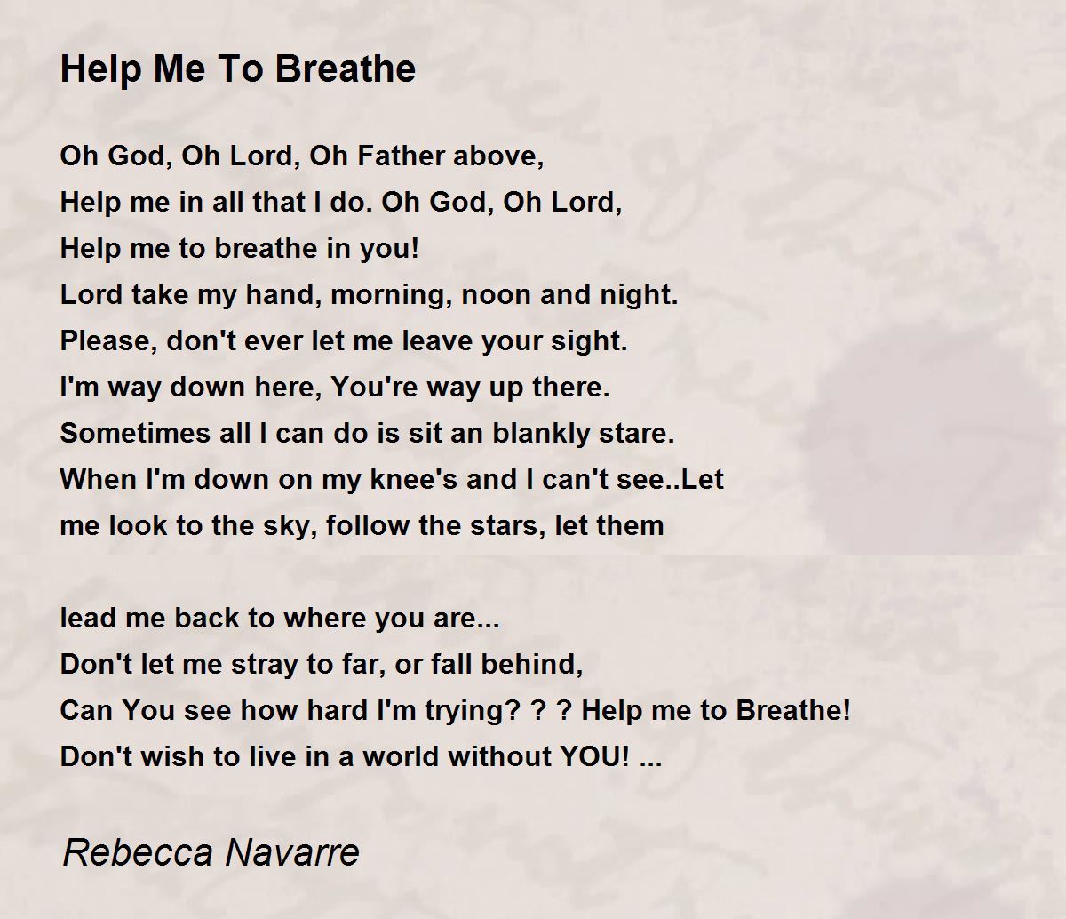 A from-the-heart prayer to the God who loves us all. You have captured the essence of so many prayers- -asking, pleading, for guidance because it is rough and tumble down here on earth. I love the line you used for your title===it is perfect, absolutely perfect, like so many of the lines in this poem.- - - - - - - - - - - - - - Help me to breathe in you! Lord take my hand, morning, noon and night. Please, don't ever let me leave your sight.- - - - - - - - - - - - - You have such a talent for lucid and revealing expressions in your poems, Rebecca! 10! ! ! ! ! ! ! ! ! ! ! ! ! ! ! ! ! ! ! ! ! ! ! ! ! ! ! ! ! ! ! ! ! ! ! ! ! ! ! ! ! ! ! ! ! ! !