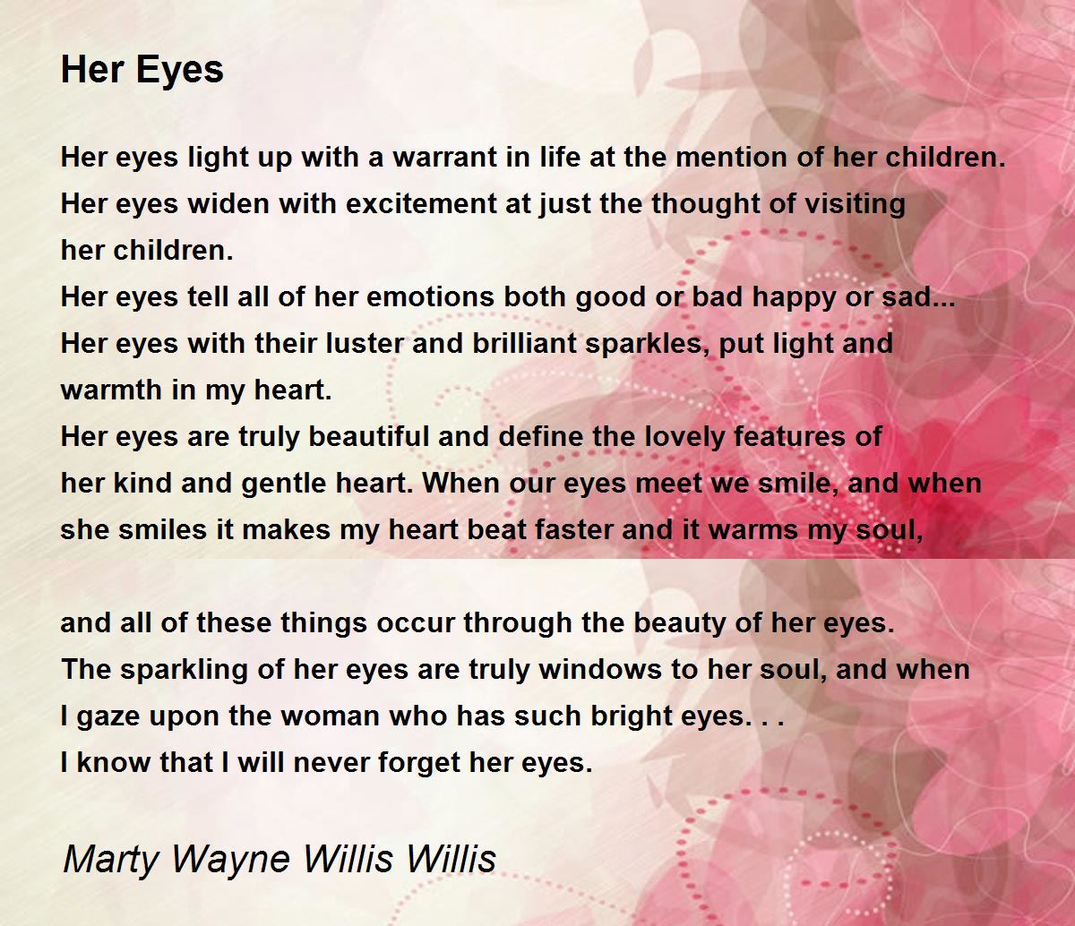 Her eyes are truly beautiful and define the lovely features of her kind and gentle heart. When our eyes meet we smile, and when she smiles it makes my heart beat faster and it warms my soul, and all of these things occur through the beauty of her eyes.