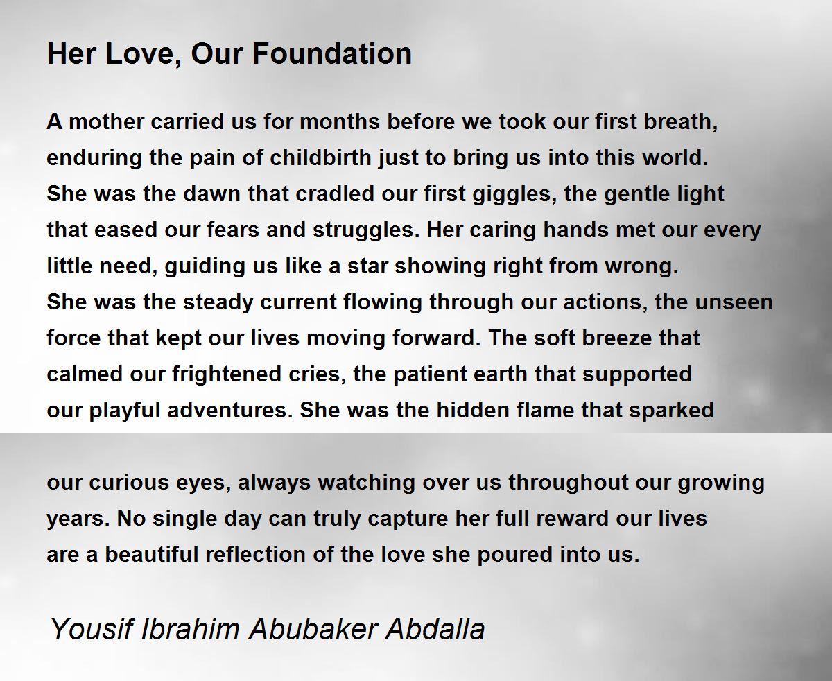A mother carried us for months before we took our first breath, enduring the pain of childbirth just to bring us into this world. She was the dawn that cradled our first giggles, the gentle light that eased our fears and struggles. Her caring hands met our every little need, guiding us like a star showing right from wrong. She was the steady current flowing through our actions, the unseen force that kept our lives moving forward. The soft breeze that calmed our frightened cries, the patient earth that supported our playful adventures. She was the hidden flame that sparked our curious eyes, always watching over us throughout our growing years. No single day can truly capture her full reward our lives are a beautiful reflection of the love she poured into us.