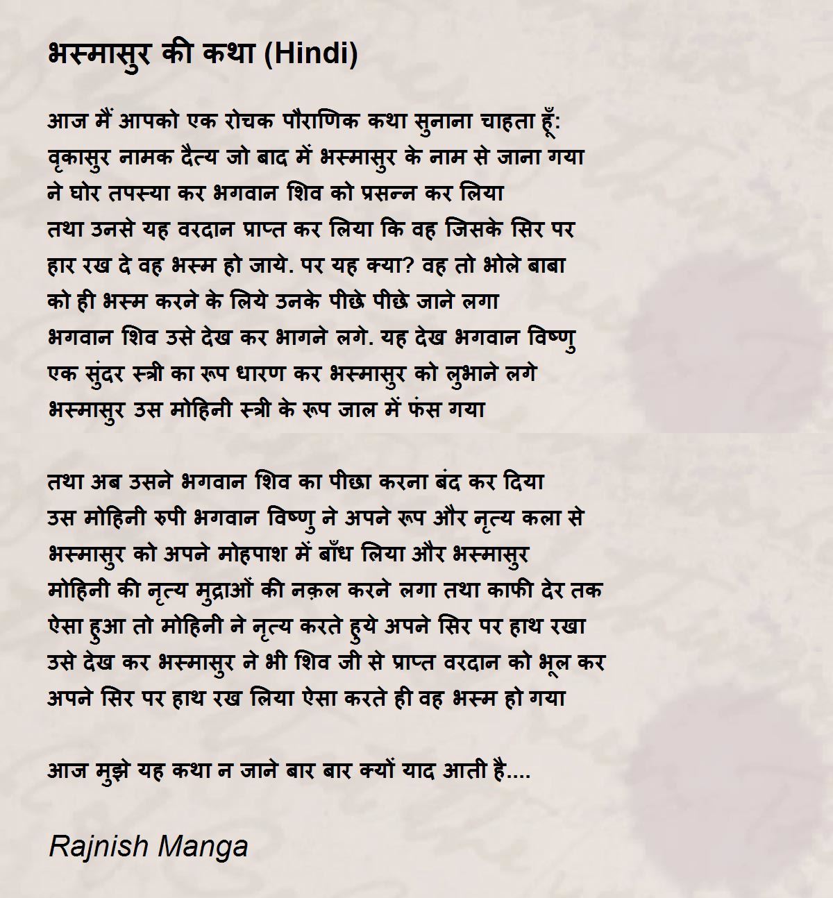 This story of Bhasmasur from mythology who was destroyed himself reveals the present situation of present society.We are destroying ourselves unknowingly by polluting air, water, and environment. Dear Manga ji, You have so brilliantly and cutely delineated this poem through a nice story telling and saying....आज मुझे यह कथा न जाने बार बार क्यों याद आती है.... Many thanks to you.10