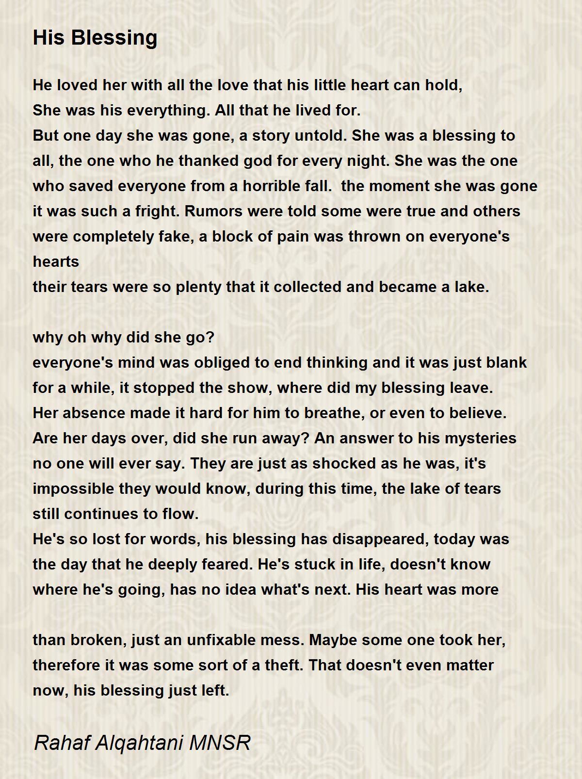 He's so lost for words, his blessing has disappeared, today was the day that he deeply feared. He's stuck in life, doesn't know where he's going, has no idea what's next. His heart was more than broken, just an unfixable mess. Maybe some one took her, therefore it was some sort of a theft. That doesn't even matter now, his blessing just left.
