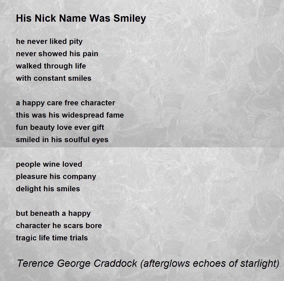 Great poems about smiley which represents a guy leading a fantastic life but upheavals cannot be ruled out in any situation. I agree with your contention- but beneath a happy character.... tragic life time trials. Thanks a lot.