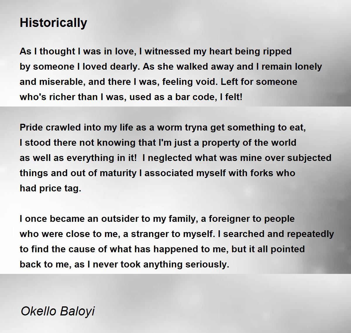 As I thought I was in love, I witnessed my heart being ripped by someone I loved dearly. As she walked away and I remain lonely and miserable, and there I was, feeling void. Left for someone who's richer than I was, used as a bar code, I felt!