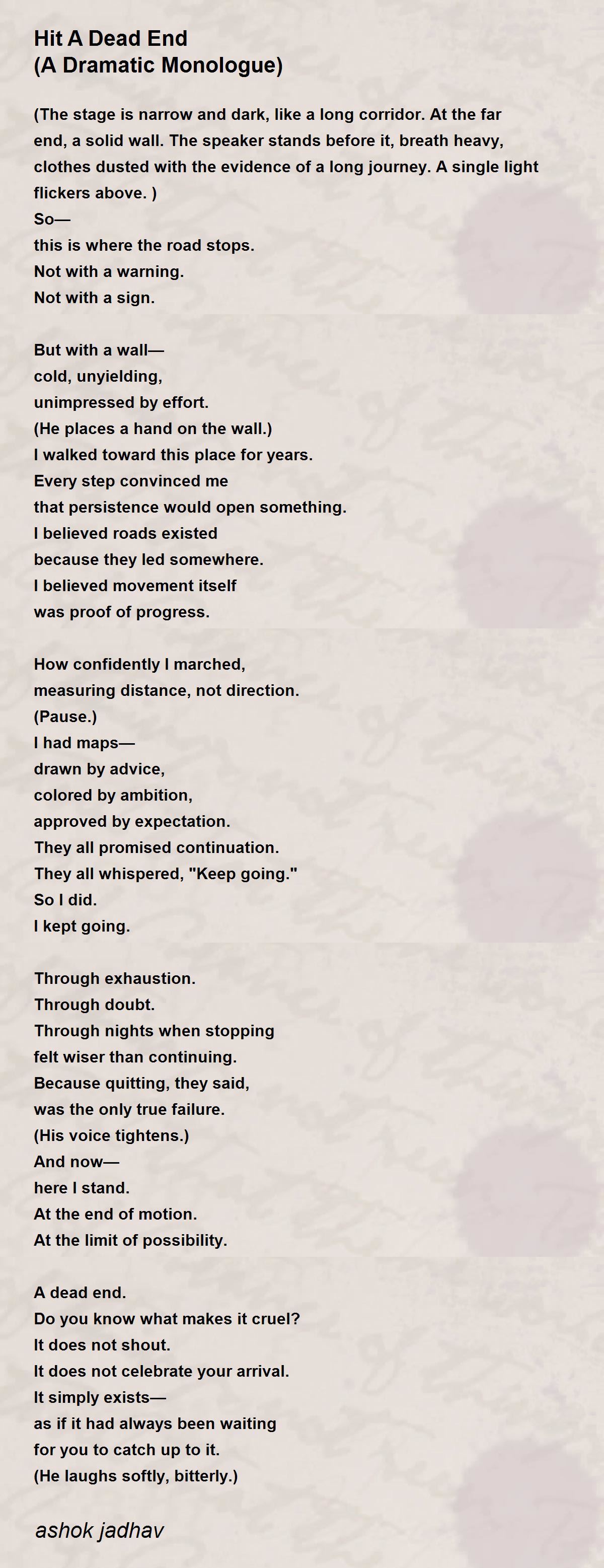 (The stage is narrow and dark, like a long corridor. At the far end, a solid wall. The speaker stands before it, breath heavy, clothes dusted with the evidence of a long journey. A single light flickers above.)