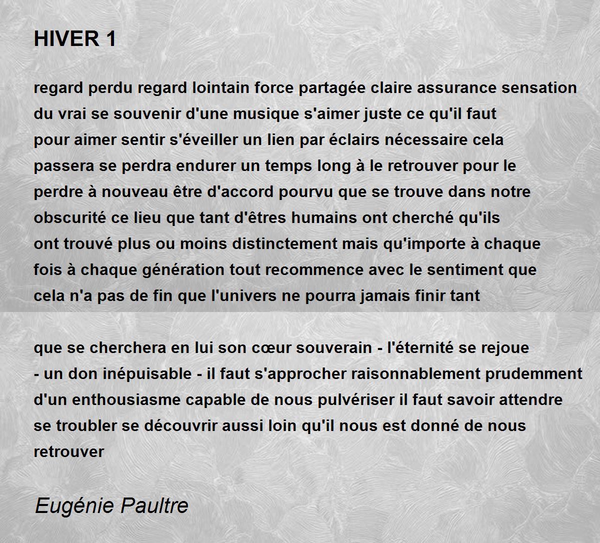regard perdu regard lointain force partagée claire assurance sensation du vrai se souvenir d'une musique s'aimer juste ce qu'il faut pour aimer sentir s'éveiller un lien par éclairs nécessaire cela passera se perdra endurer un temps long à le retrouver pour le perdre à nouveau être d'accord pourvu que se trouve dans notre obscurité ce lieu que tant d'êtres humains ont cherché qu'ils ont trouvé plus ou moins distinctement mais qu'importe à chaque fois à chaque génération tout recommence avec le sentiment que cela n'a pas de fin que l'univers ne pourra jamais finir tant que se cherchera en lui son cœur souverain - l'éternité se rejoue - un don inépuisable - il faut s'approcher raisonnablement prudemment d'un enthousiasme capable de nous pulvériser il faut savoir attendre se troubler se découvrir aussi loin qu'il nous est donné de nous retrouver