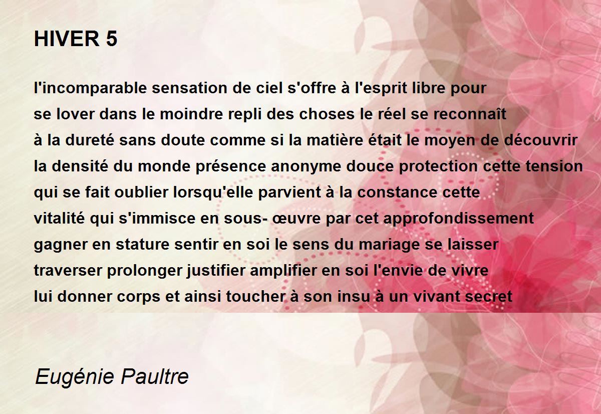 l'incomparable sensation de ciel s'offre à l'esprit libre pour se lover dans le moindre repli des choses le réel se reconnaît à la dureté sans doute comme si la matière était le moyen de découvrir la densité du monde présence anonyme douce protection cette tension qui se fait oublier lorsqu'elle parvient à la constance cette vitalité qui s'immisce en sous-œuvre par cet approfondissement gagner en stature sentir en soi le sens du mariage se laisser traverser prolonger justifier amplifier en soi l'envie de vivre lui donner corps et ainsi toucher à son insu à un vivant secret