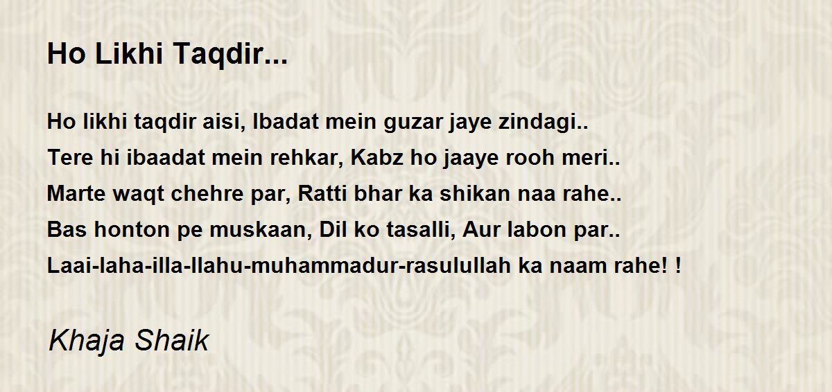 Ho likhi taqdir aisi, Ibadat mein guzar jaye zindagi..