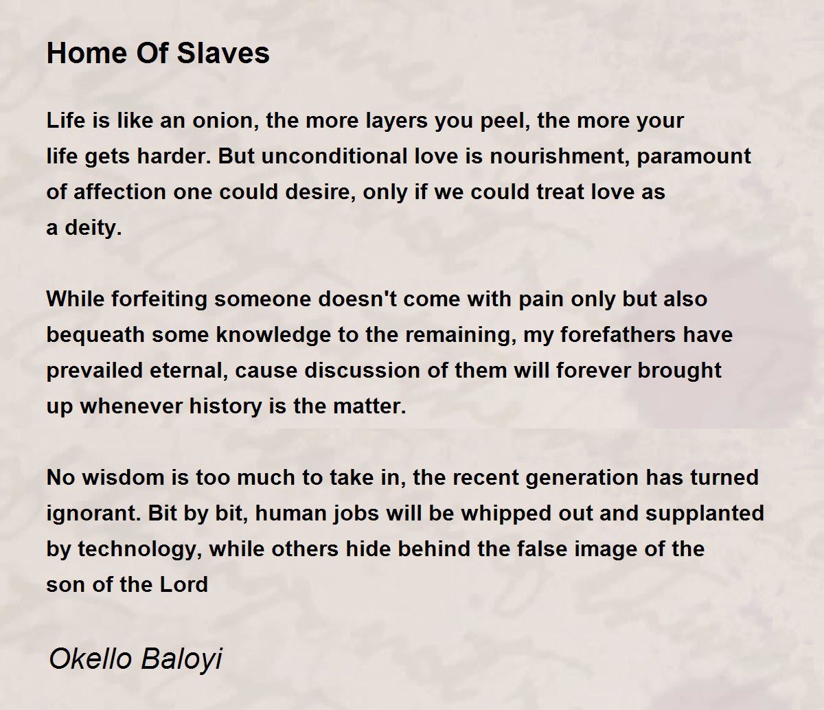 No wisdom is too much to take in, the recent generation has turned ignorant. Bit by bit, human jobs will be whipped out and supplanted by technology, while others hide behind the false image of the son of the Lord