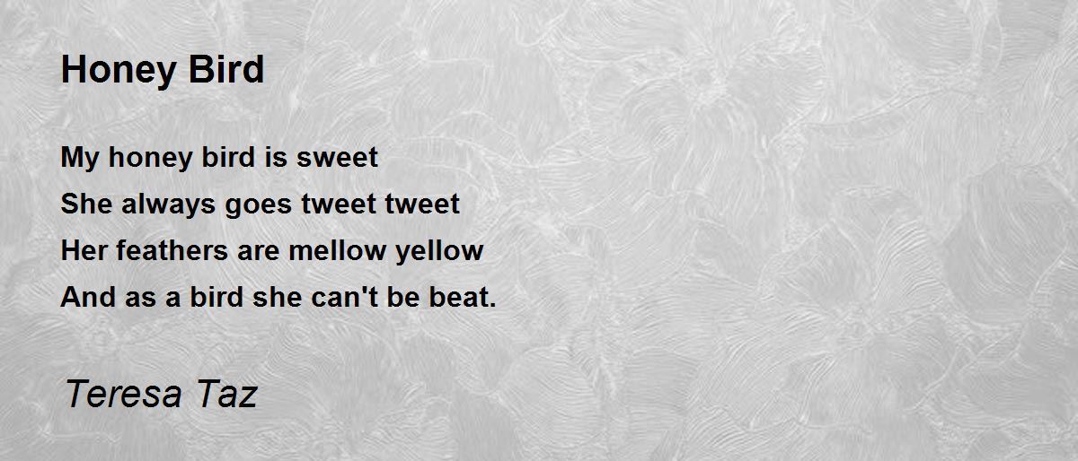 My honey bird is sweet She always goes tweet tweet Her feathers are mellow yellow And as a bird she can't be beat.