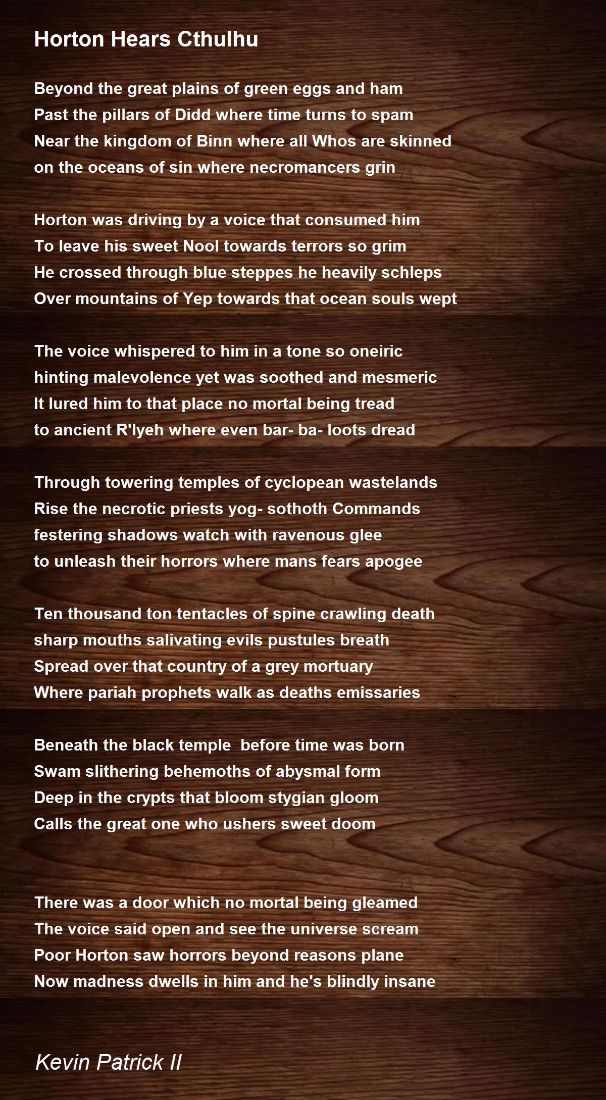 There was a door which no mortal being gleamed The voice said open and see the universe scream Poor Horton saw horrors beyond reasons plane Now madness dwells in him and he's blindly insane