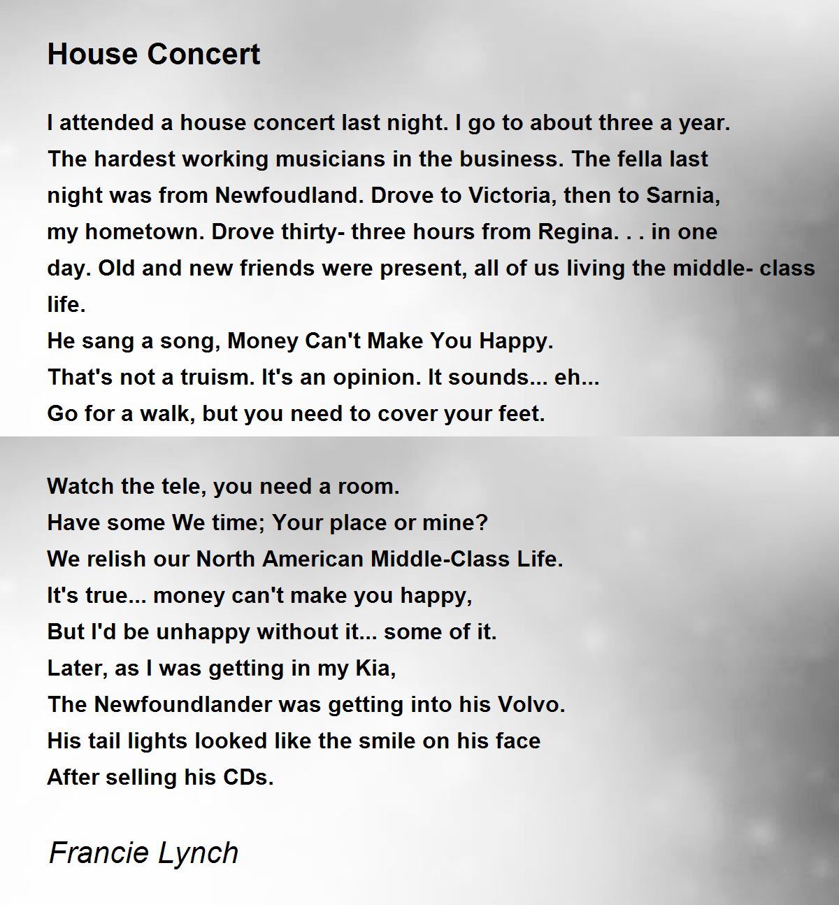 I attended a house concert last night. I go to about three a year. The hardest working musicians in the business. The fella last night was from Newfoudland. Drove to Victoria, then to Sarnia, my hometown. Drove thirty-three hours from Regina... in one day. Old and new friends were present, all of us living the middle-class life.