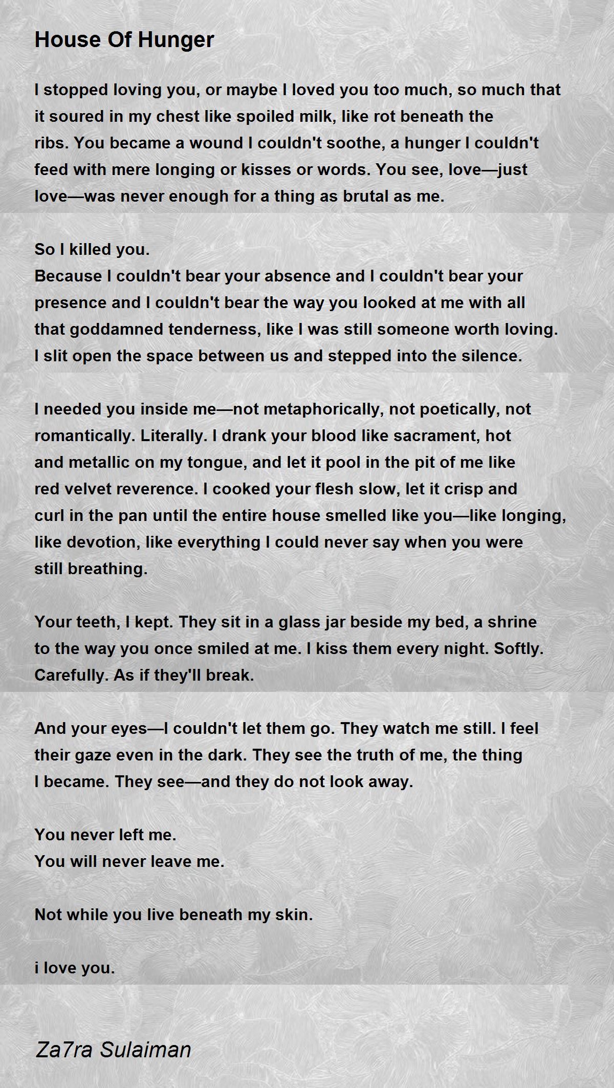 I needed you inside me—not metaphorically, not poetically, not romantically. Literally. I drank your blood like sacrament, hot and metallic on my tongue, and let it pool in the pit of me like red velvet reverence. I cooked your flesh slow, let it crisp and curl in the pan until the entire house smelled like you—like longing, like devotion, like everything I could never say when you were still breathing.