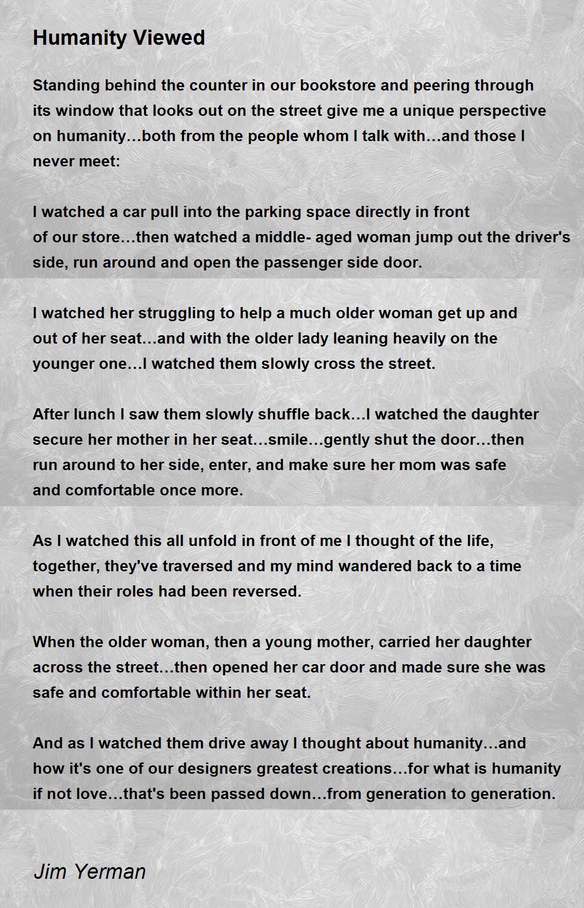 And as I watched them drive away I thought about humanity…and how it's one of our designers greatest creations…for what is humanity if not love…that's been passed down…from generation to generation.