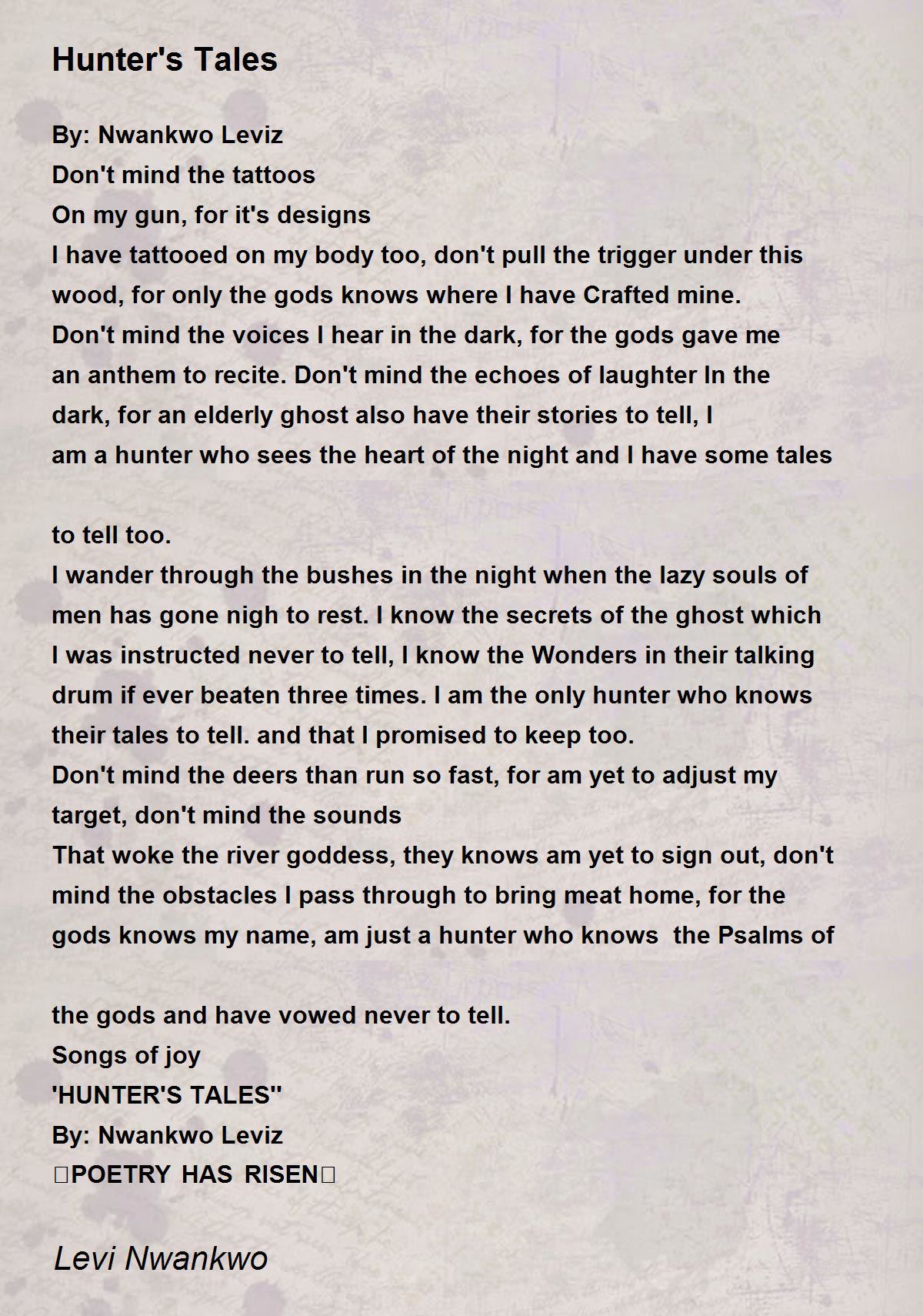 I wander through the bushes in the night when the lazy souls of men has gone nigh to rest. I know the secrets of the ghost which I was instructed never to tell, I know the Wonders in their talking drum if ever beaten three times. I am the only hunter who knows their tales to tell.and that I promised to keep too.