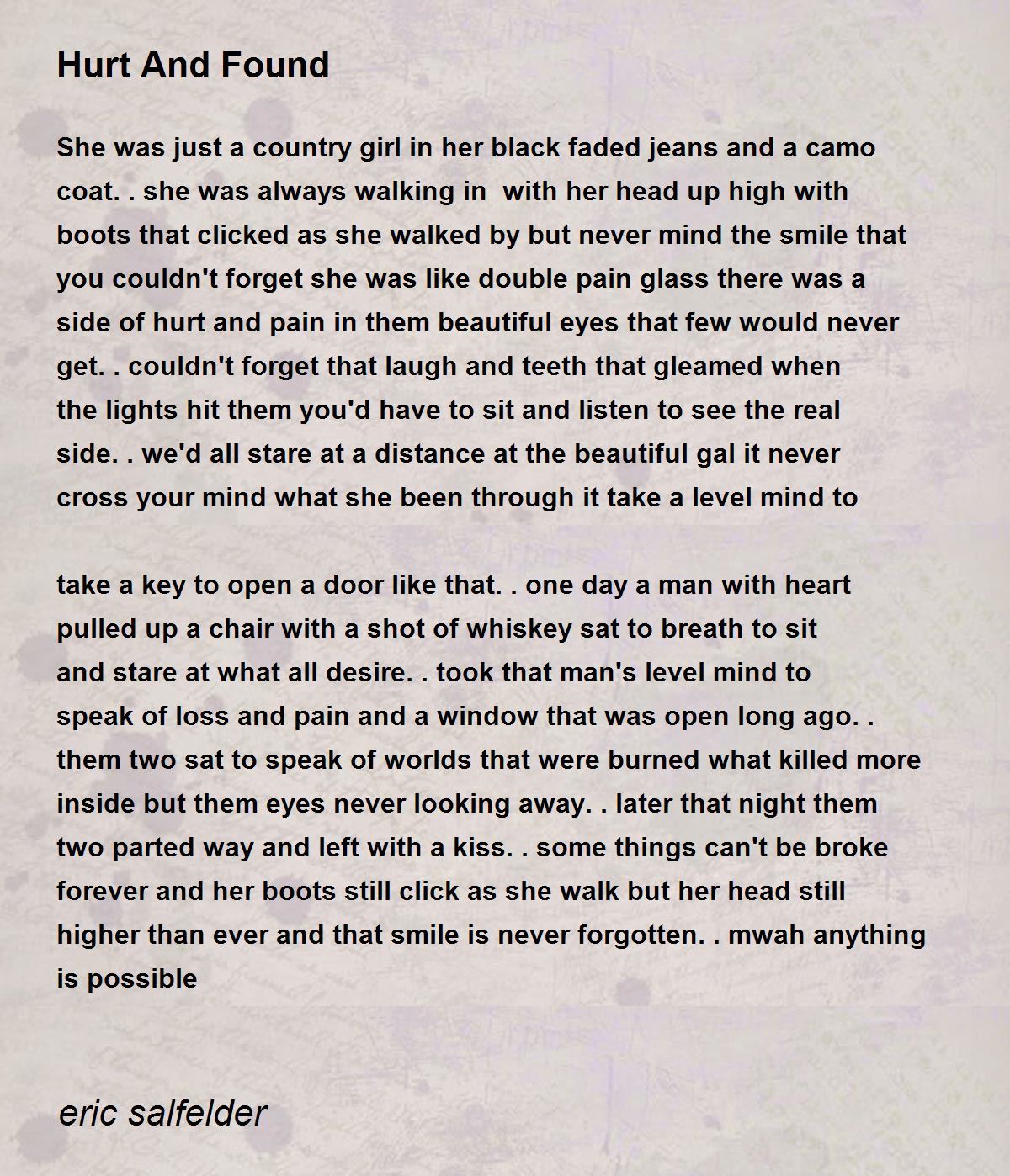She was just a country girl in her black faded jeans and a camo coat..she was always walking in with her head up high with boots that clicked as she walked by but never mind the smile that you couldn't forget she was like double pain glass there was a side of hurt and pain in them beautiful eyes that few would never get.. couldn't forget that laugh and teeth that gleamed when the lights hit them you'd have to sit and listen to see the real side.. we'd all stare at a distance at the beautiful gal it never cross your mind what she been through it take a level mind to take a key to open a door like that.. one day a man with heart pulled up a chair with a shot of whiskey sat to breath to sit and stare at what all desire.. took that man's level mind to speak of loss and pain and a window that was open long ago.. them two sat to speak of worlds that were burned what killed more inside but them eyes never looking away.. later that night them two parted way and left with a kiss.. some things can't be broke forever and her boots still click as she walk but her head still higher than ever and that smile is never forgotten.. mwah anything is possible