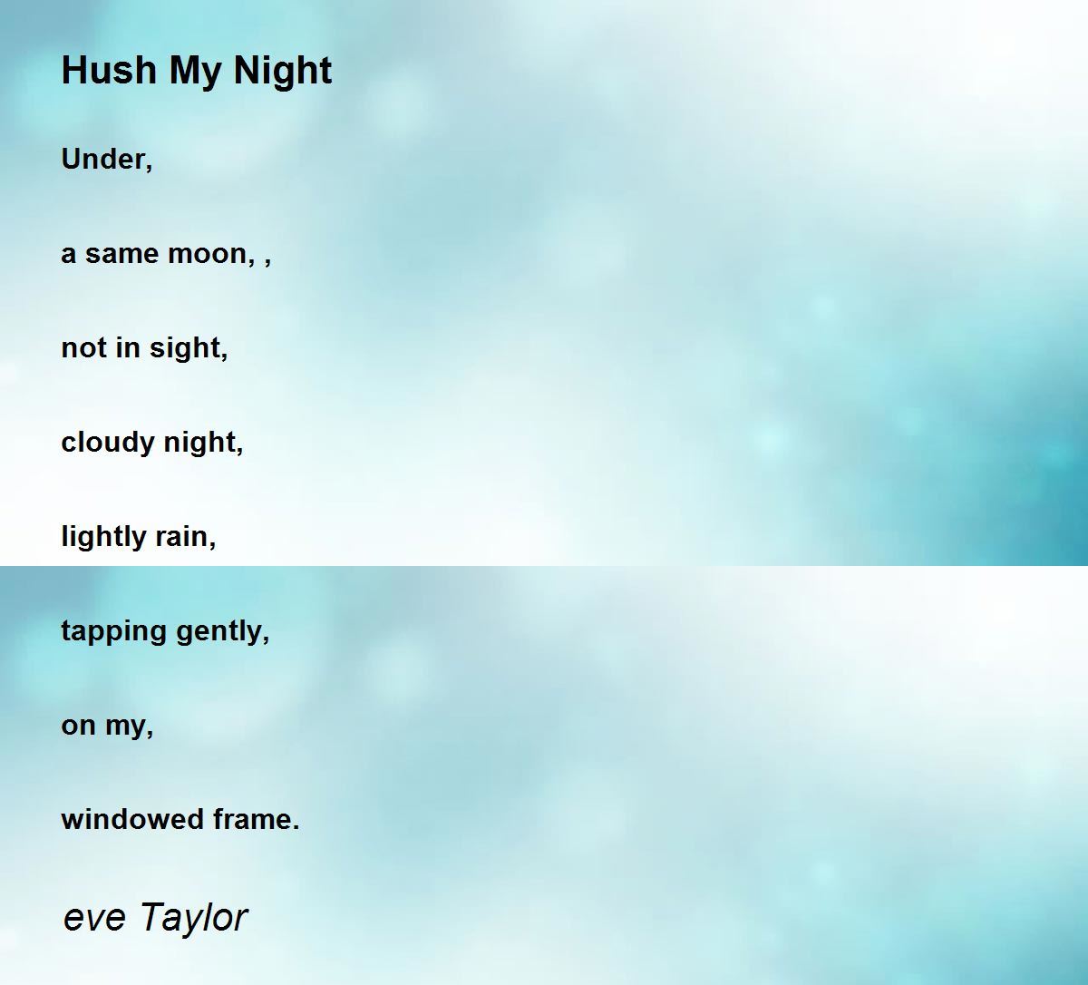 Under, a same moon, , not in sight, cloudy night, lightly rain, tapping gently, on my, windowed frame.